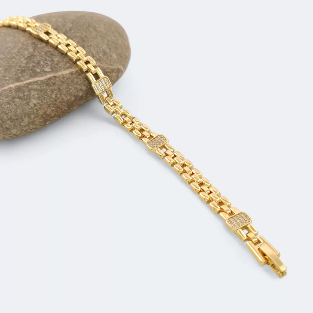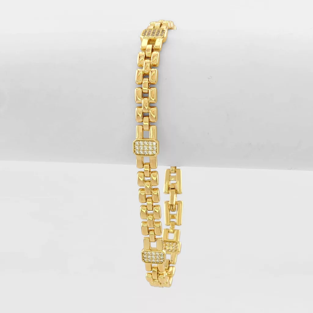 Aranysárga színű karkötő, melyet fehér cirkónia kristályok tesznek csillogóvá.