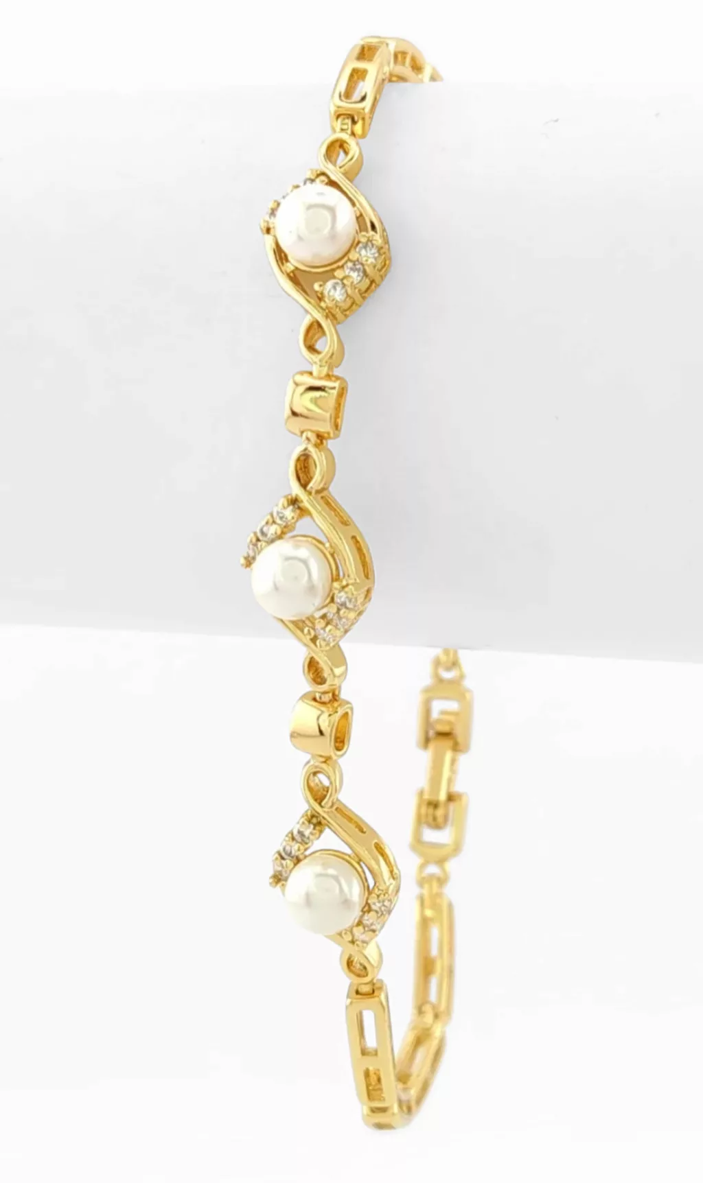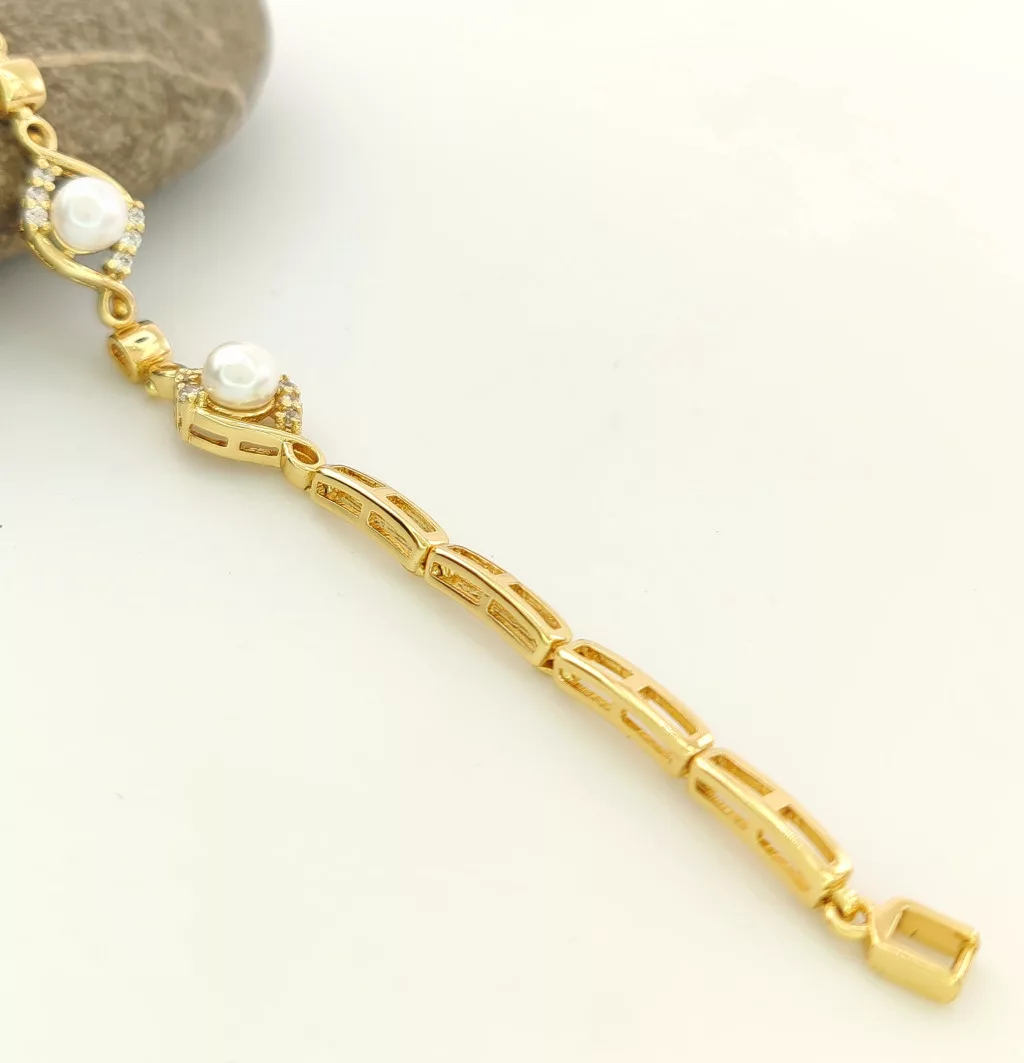 Aranysárga színű karkötő, melyet fehér cirkónia kristályok tesznek csillogóvá és fehér tekla gyöngyök díszítenek.