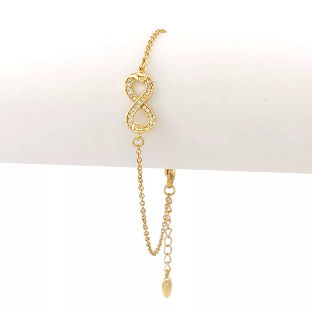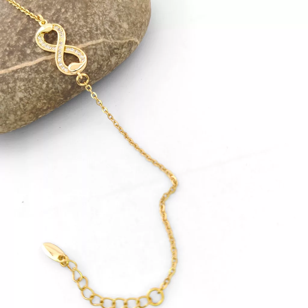 Aranysárga színű karkötő, melyet végtelen motívum díszít és fehér cirkónia kristályok tesznek csillogóvá.