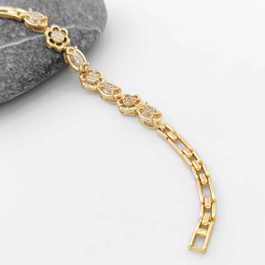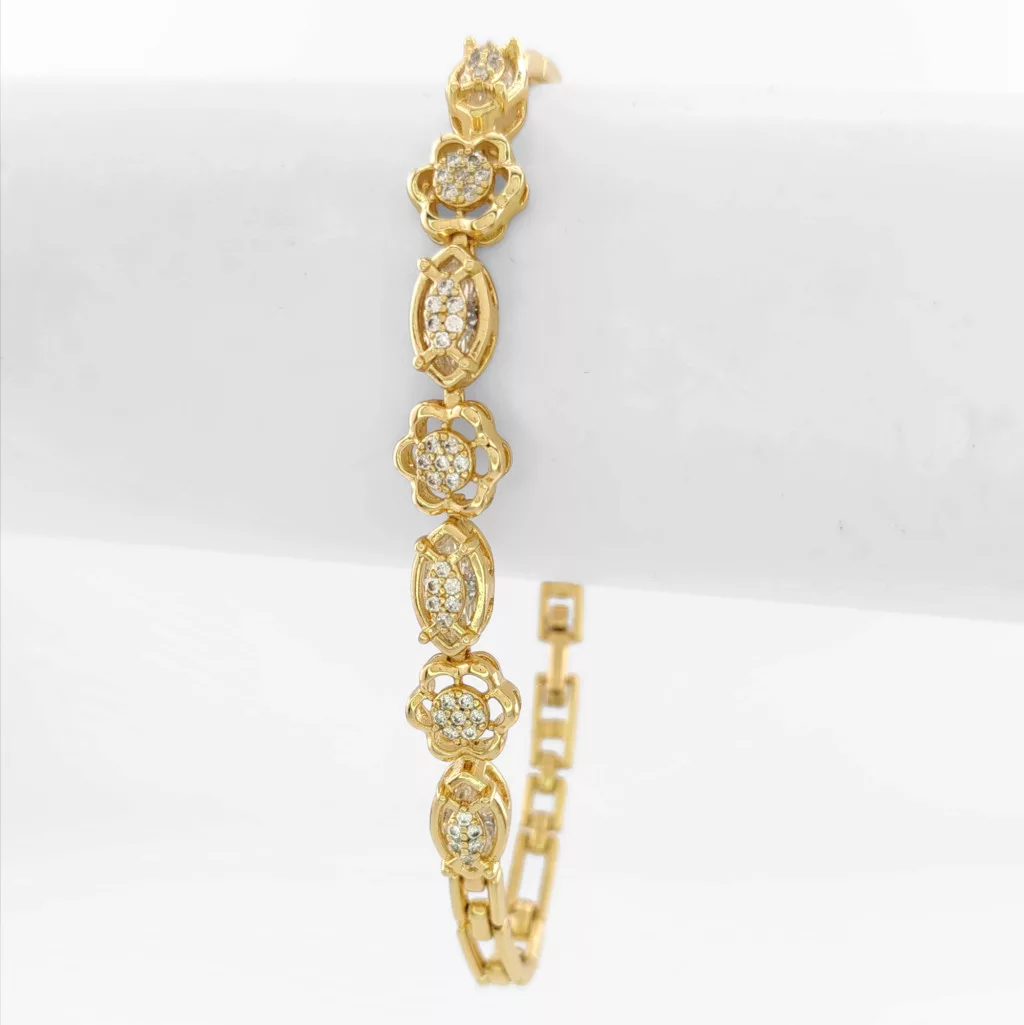Aranysárga színű karkötő, melyet fehér cirkónia kristályok tesznek csillogóvá és virág alakú szemek díszítenek.