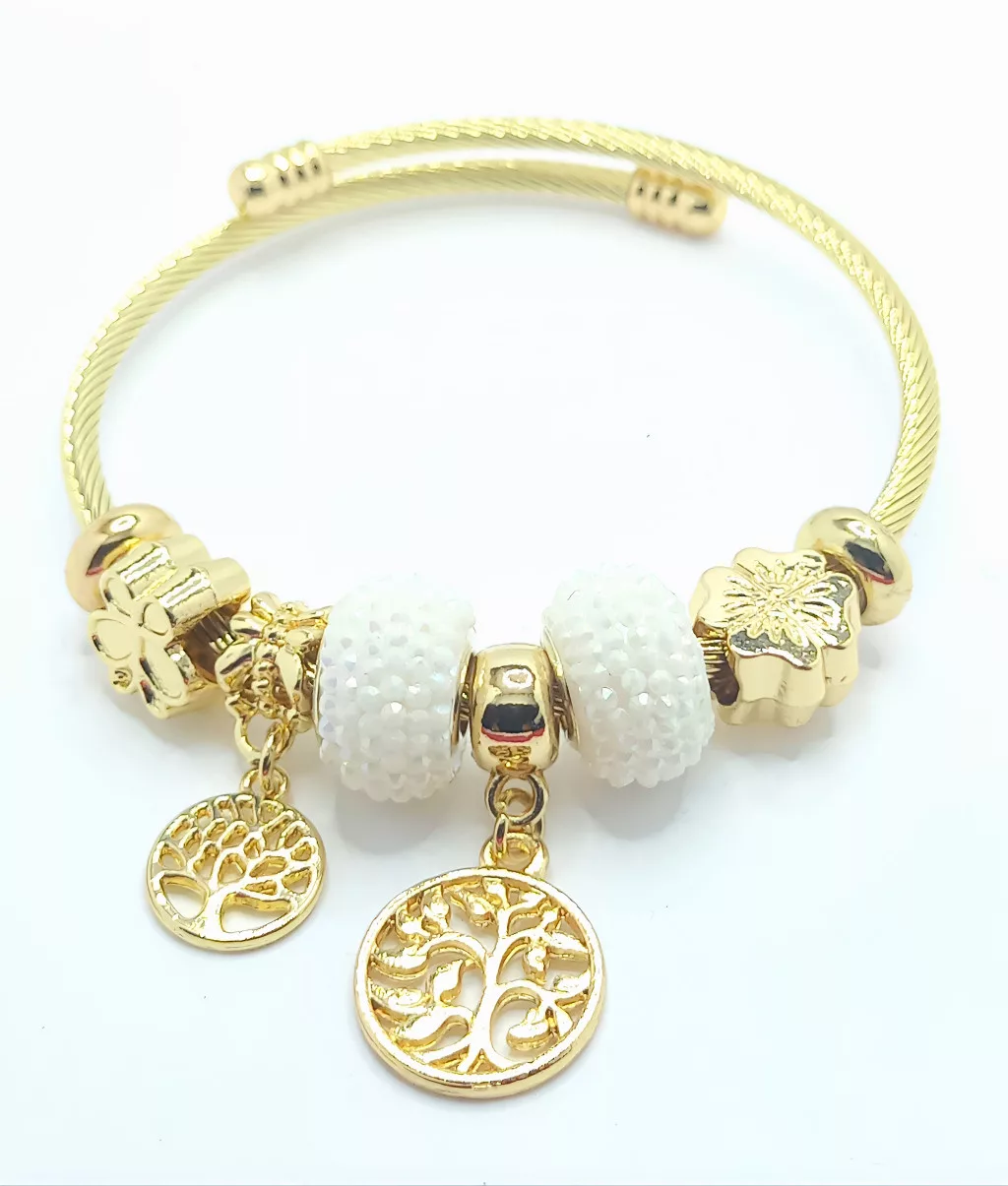 Aranyszínű nemesacél ( 316L ) pandora jellegű karkötő, melyet életfa, pillangó, virág alakú charmok és fehér kristályok díszítenek.
