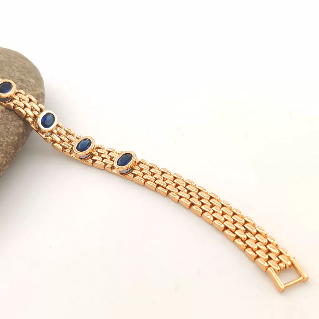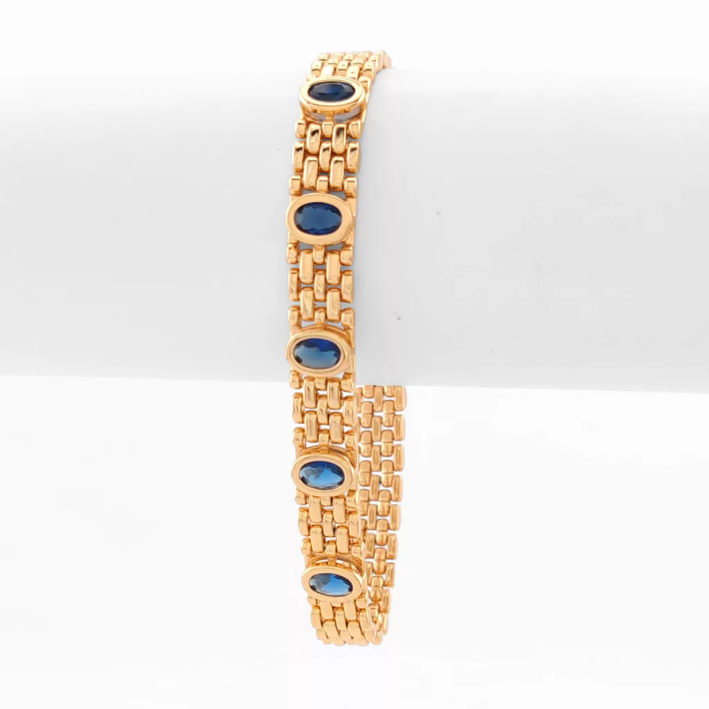 Aranyszínű karkötő, melyet királykék cirkónia kristályok tesznek csillogóvá.