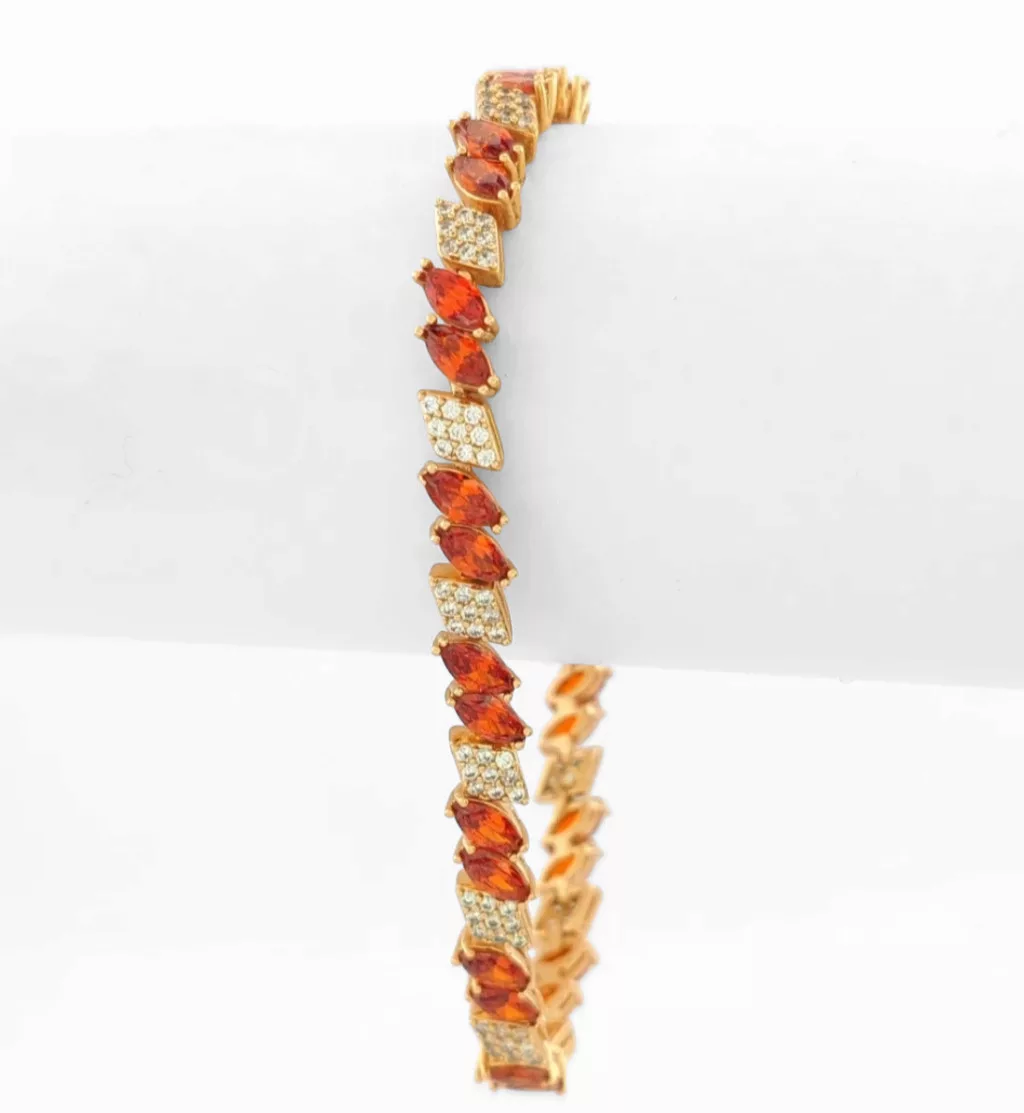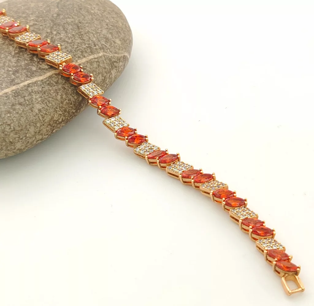 Aranyszínű karkötő, melyet piros és fehér cirkónia kristály tesz csillogóvá.