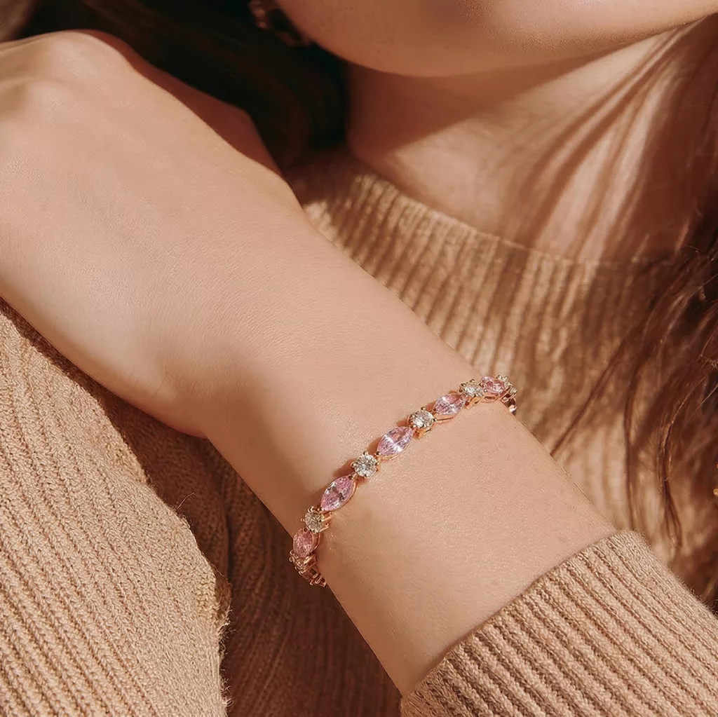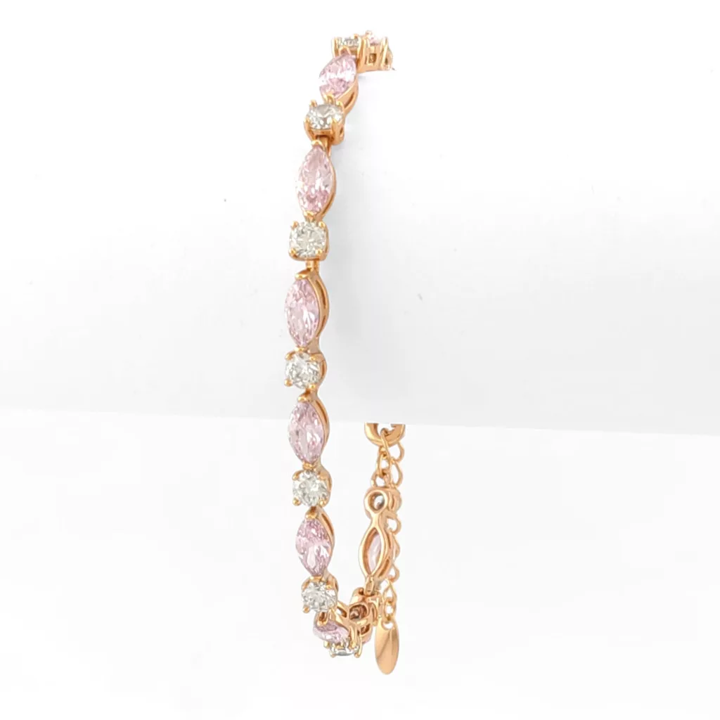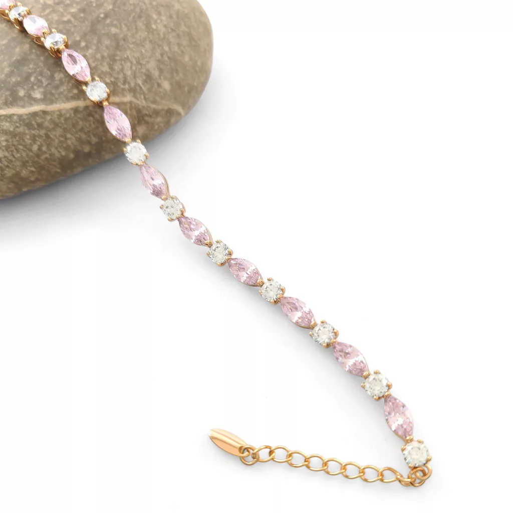 Aranyszínű karkötő, melyet rózsaszín és fehér cirkónia kristályok tesznek csillogóvá.