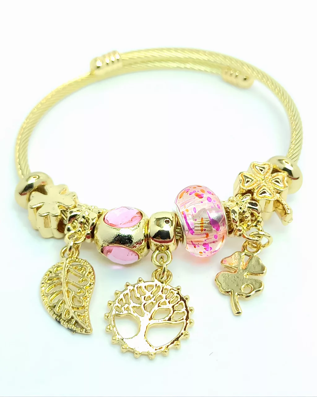 Aranyszínű nemesacél ( 316L )pandora jellegű karkötő, melyet négylevelű lóhere, életfa, levél mintás charmok és rózsaszín kristályok díszítenek.