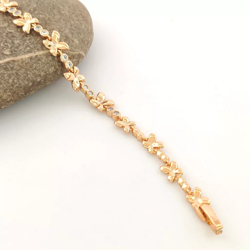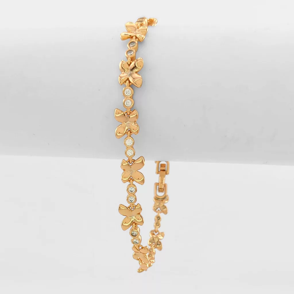 Aranyszínű karkötő, melyet fehér cirkónia kristályok tesznek csillogóvá és pillangó formájú szemek teszik különlegessé.