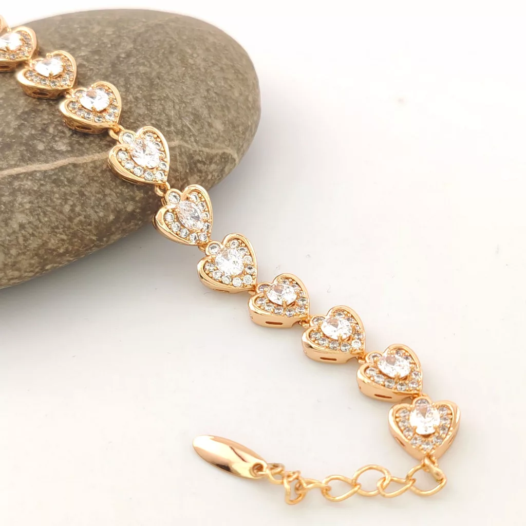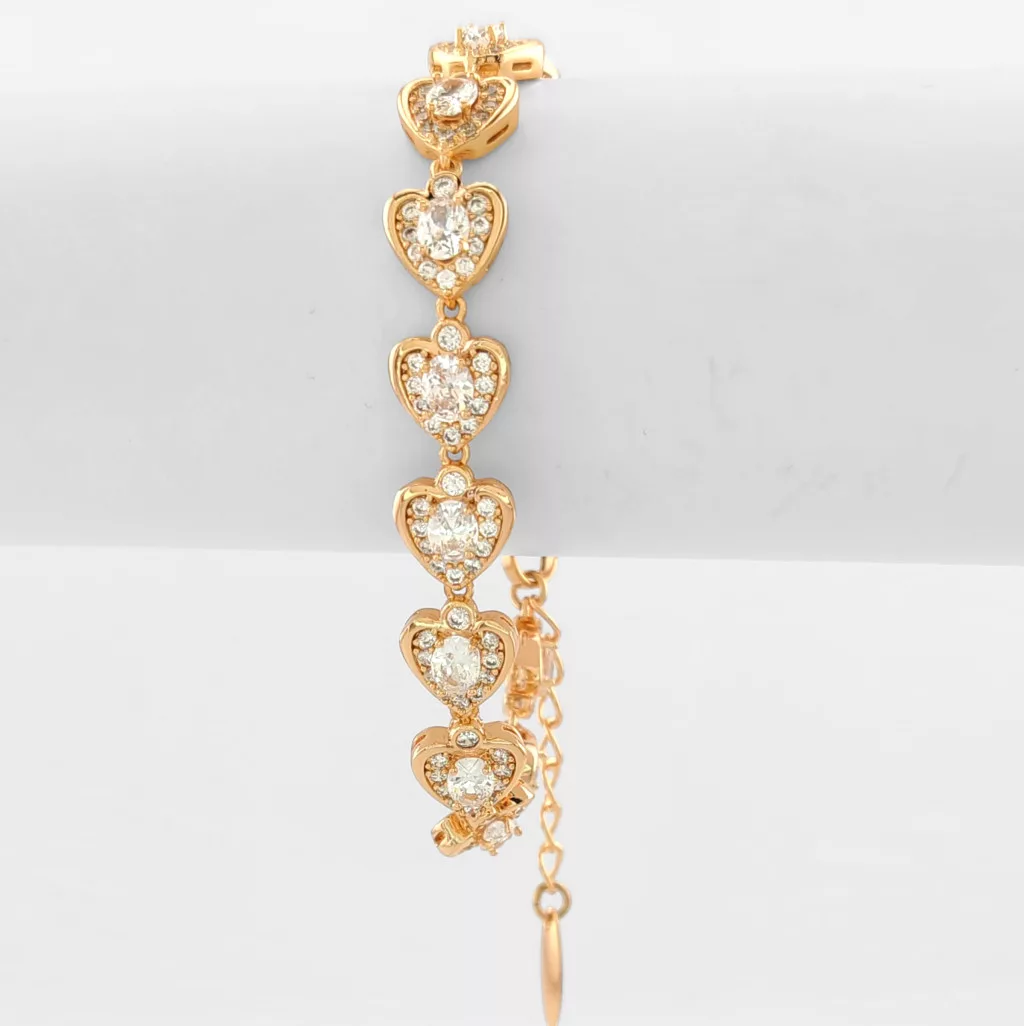 Aranyszínű karkötő, melyet csillogó fehér cirkónia kristályokkal díszített szív alakú szemek tesznek különlegessé.