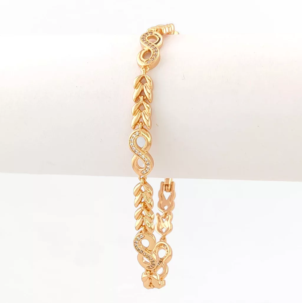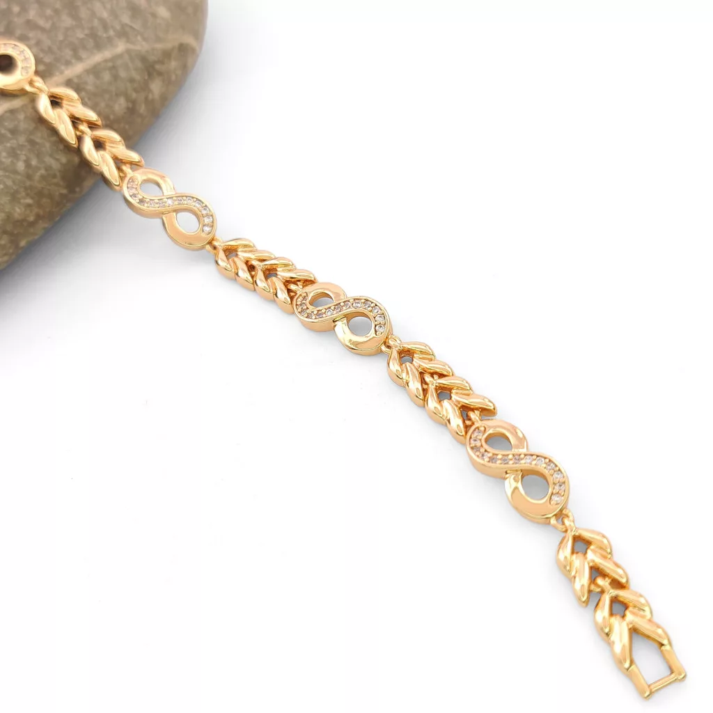 Aranyszínű karkötő, melyet végtelen jel motívumok díszítenek és fehér cirkónia kristályok tesznek csillogóvá.
