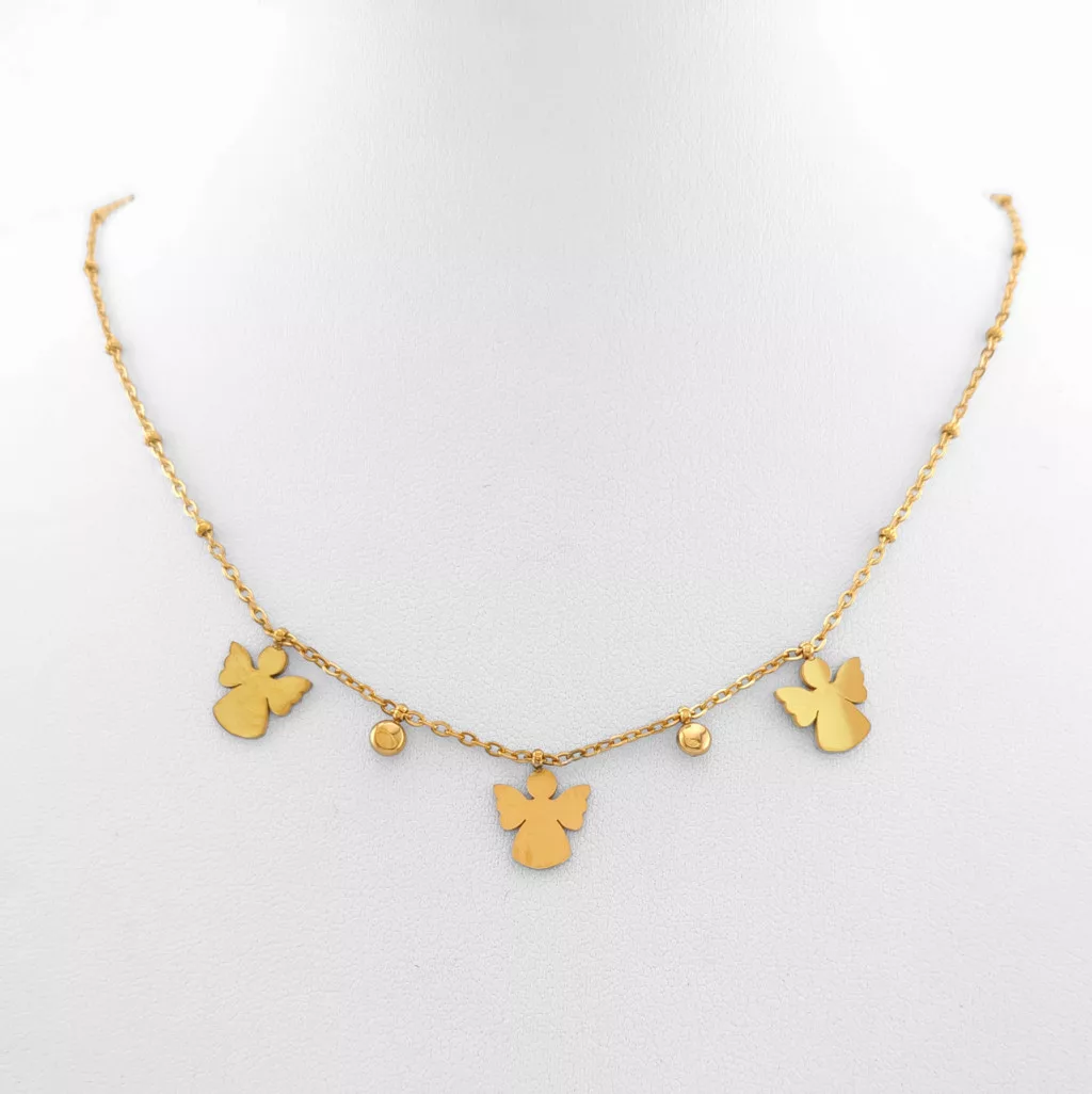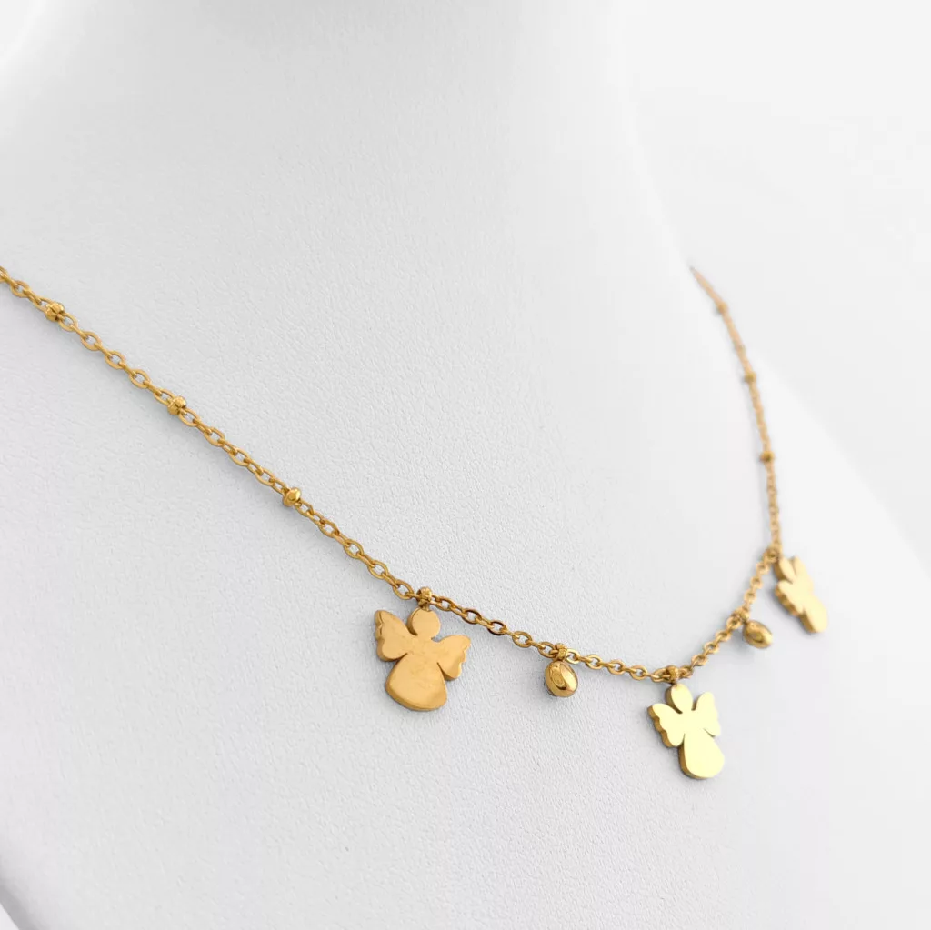 Aranyszínű nemesacél ( 316L ) nyaklánc, nemesacél ( 316L ) angyalka medálok, apró gömbök és csillogó fehér cirkónia kristályok díszítenek.