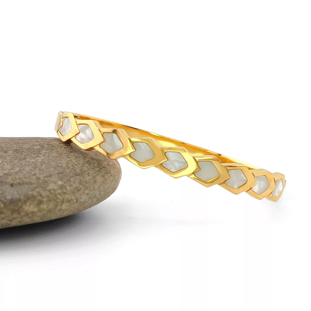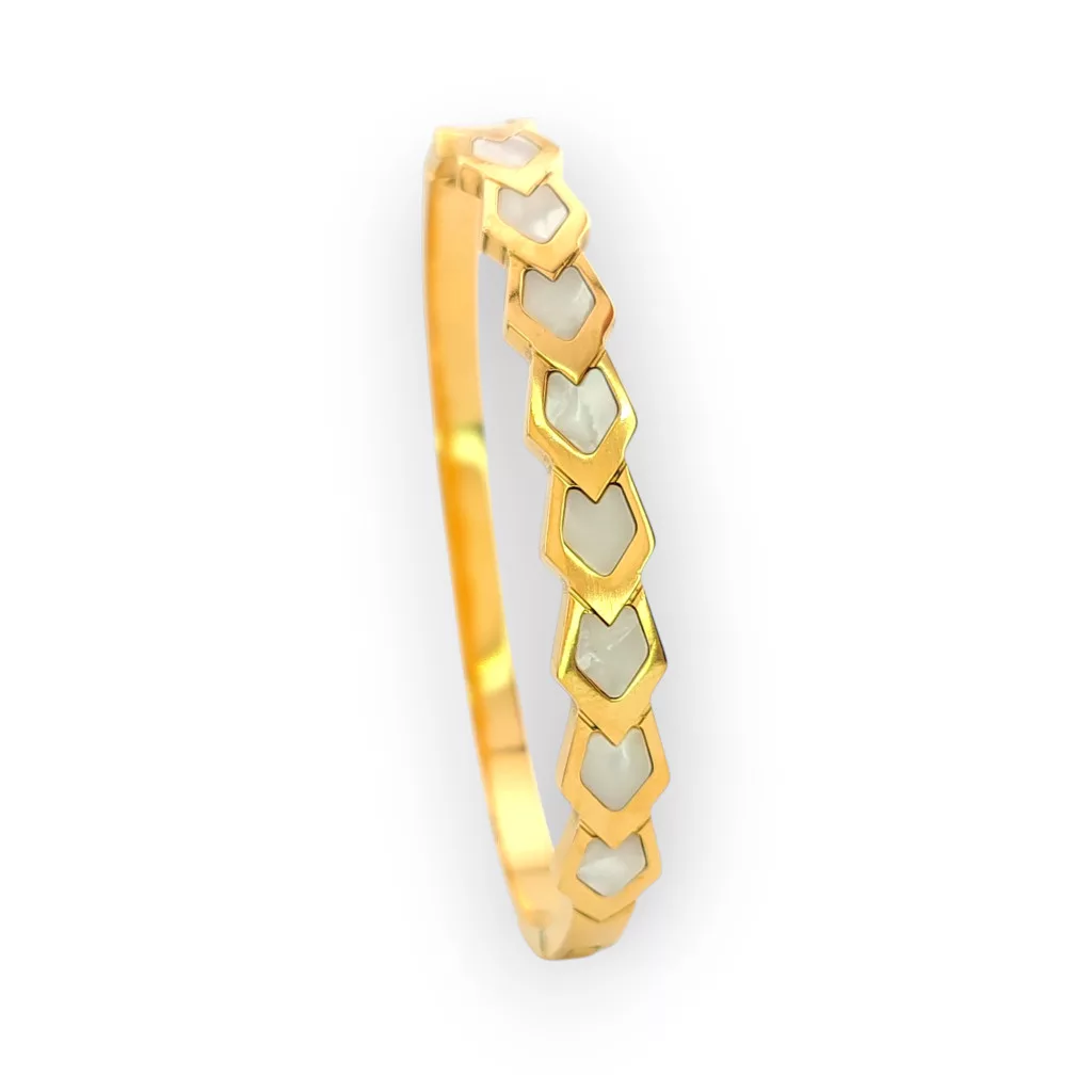 Aranyszínű nemesacél (316L) karperec, melyet csillogó márványos kagyló belső díszít.