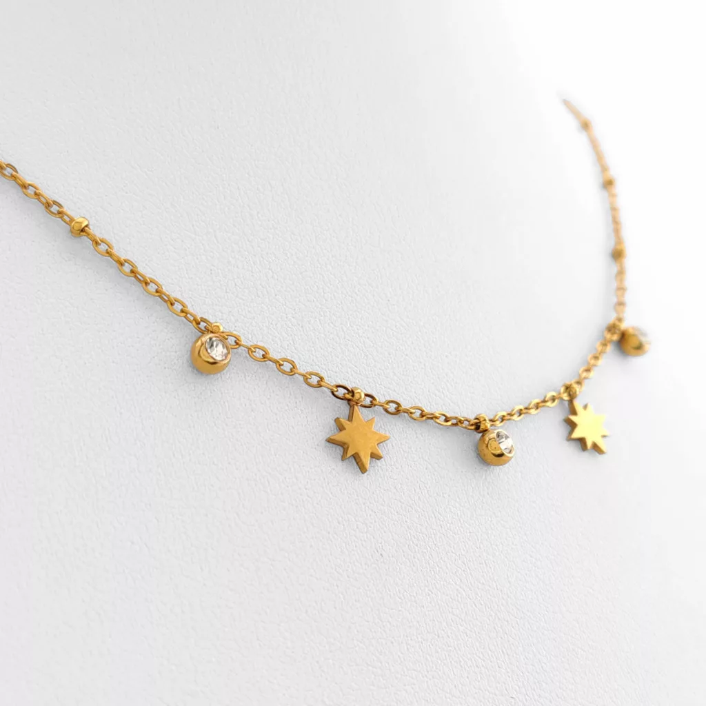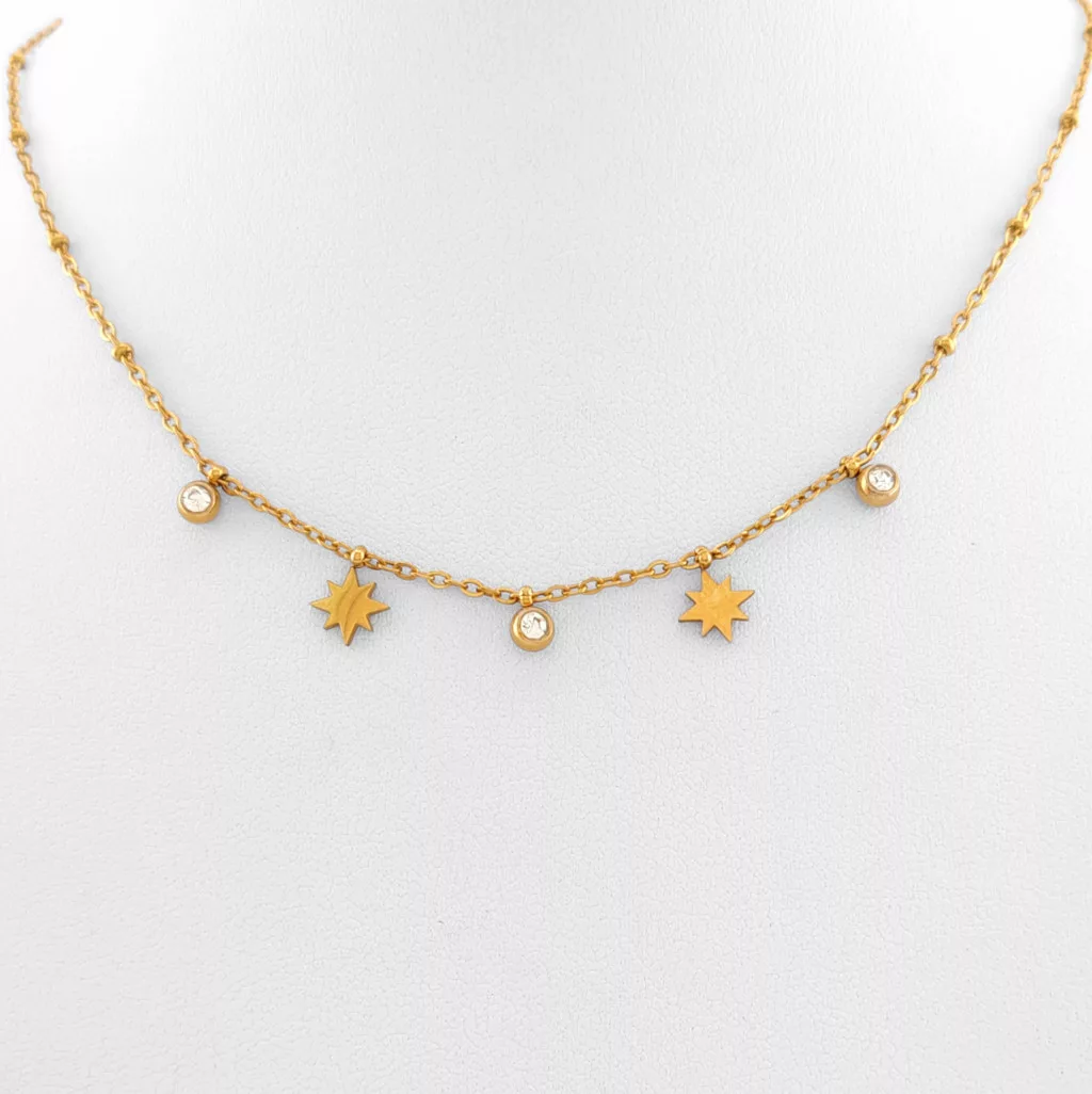 Aranyszínű nemesacél ( 316L ) nyaklánc, melyet csillag medálok és cirkónia kristály díszít.
