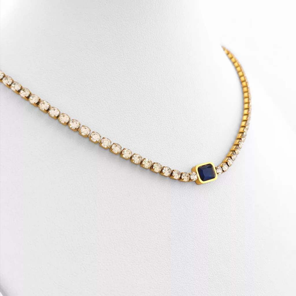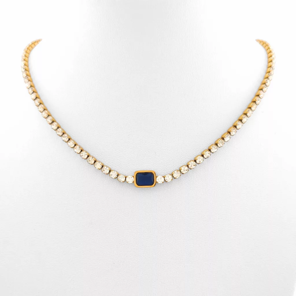 Aranyszínű nemesacél ( 316L ) nyaklánc, melyet csillogó királykék és fehér cirkónia kristályok díszítenek.
