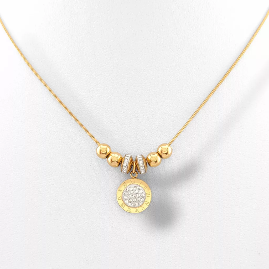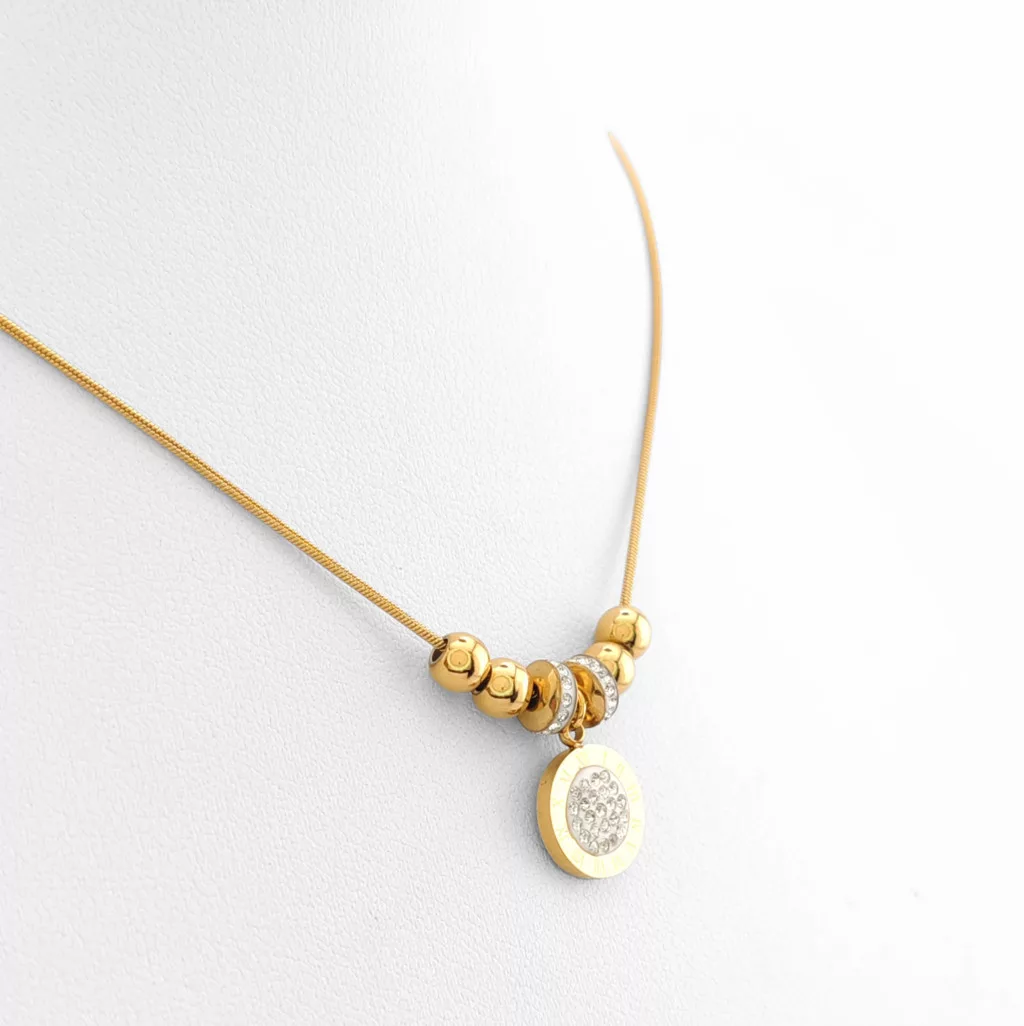 Aranyszínű nemesacél ( 316L ) nyaklánc medállal, melyet fehér cirkónia kristályok és nemesacél gömbök díszítenek díszítenek.