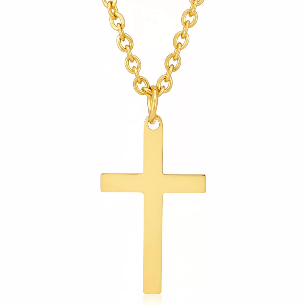 Aranyszínű nemesacél ( 316L ) nyaklánc, kereszt alakú nemesacél ( 316L ) medállal.