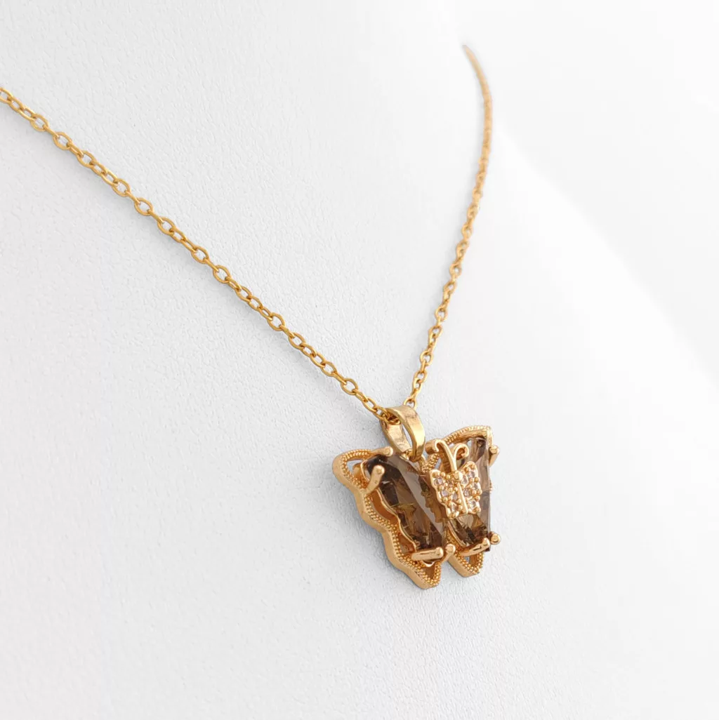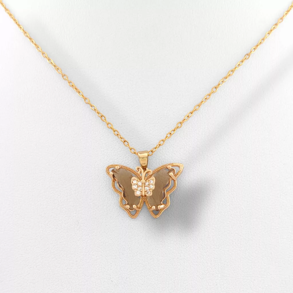 Aranyszínű nemesacél ( 316L ) nyaklánc, pillangó medállal, melyet aranybarna és fehér cirkónia kristályok díszítenek.