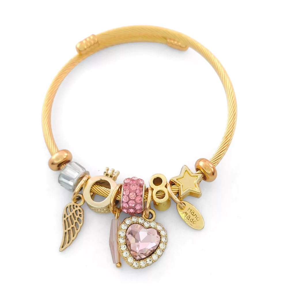 Aranyszínű nemesacél pandora jellegű karperec angyalszárny és szív charmokkal