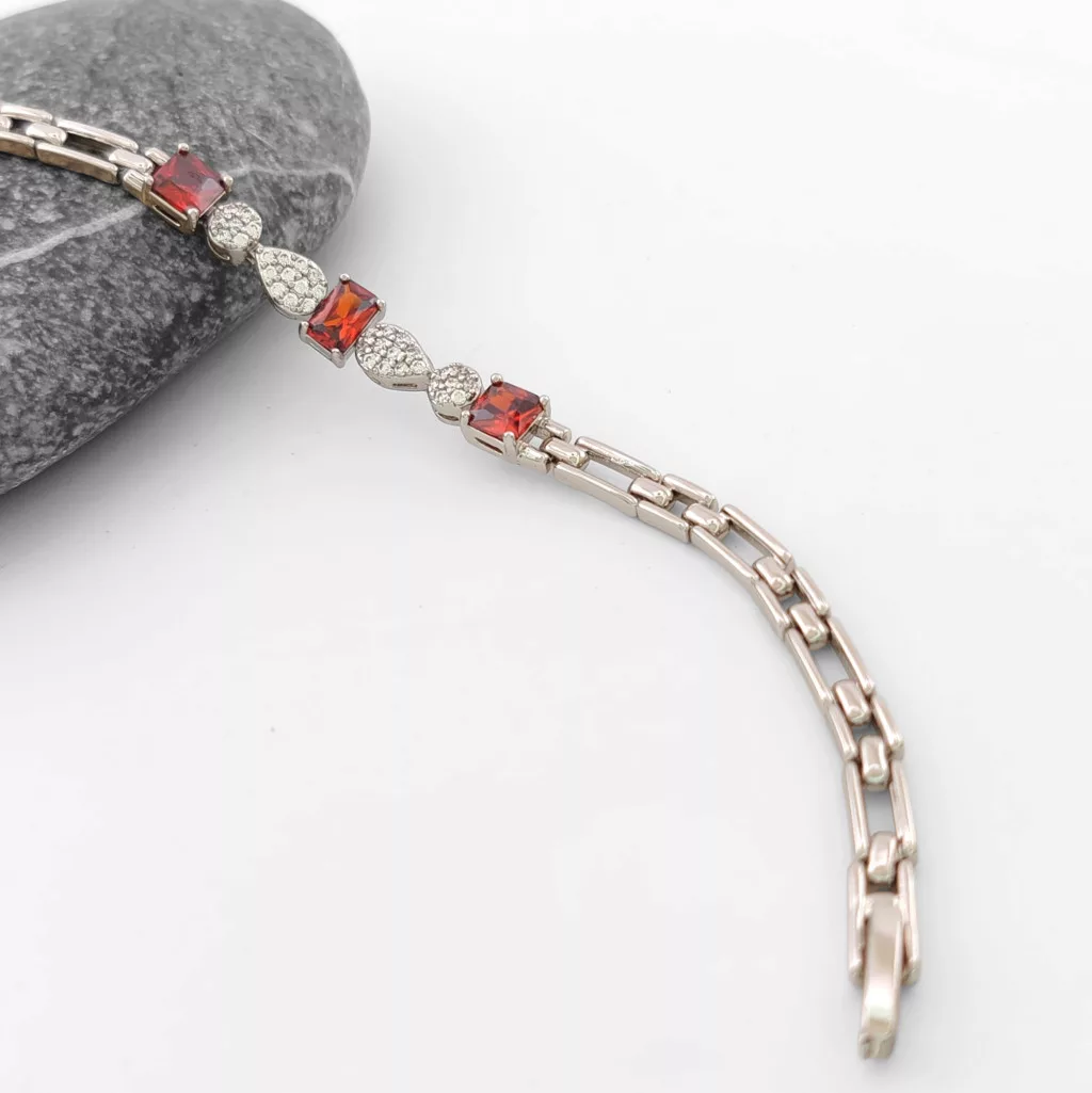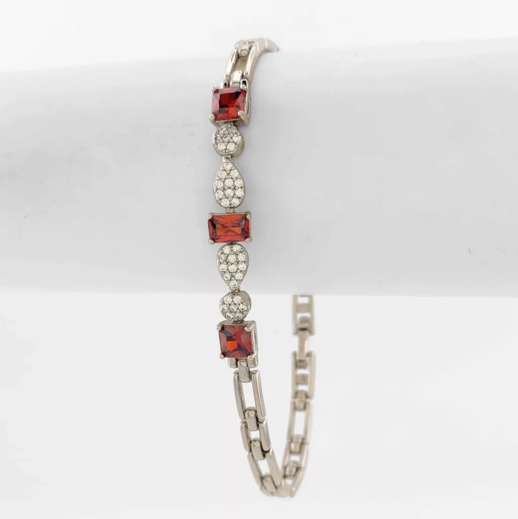 Ezüstszínű karkötő, melyet bordó és fehér cirkónia kristályok tesznek csillogóvá.