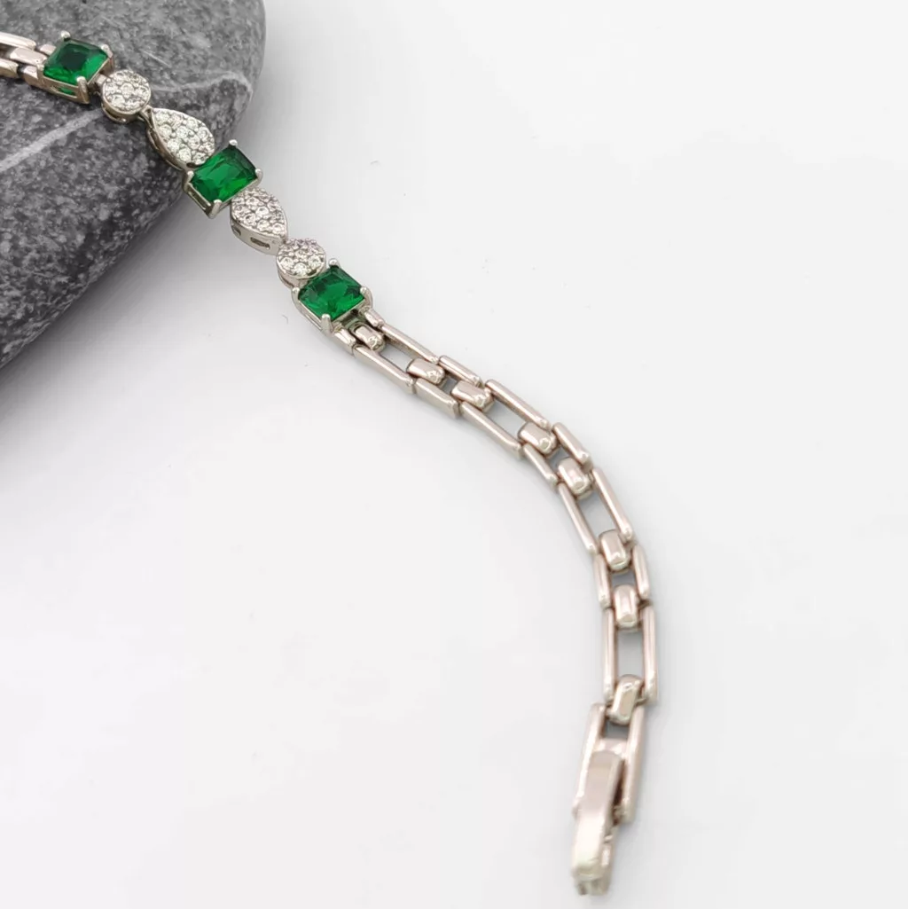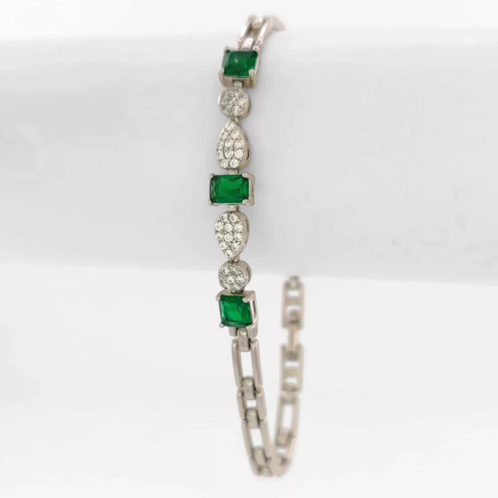 Ezüstszínű karkötő, melyet smaragdzöld és fehér cirkónia kristályok tesznek csillogóvá.