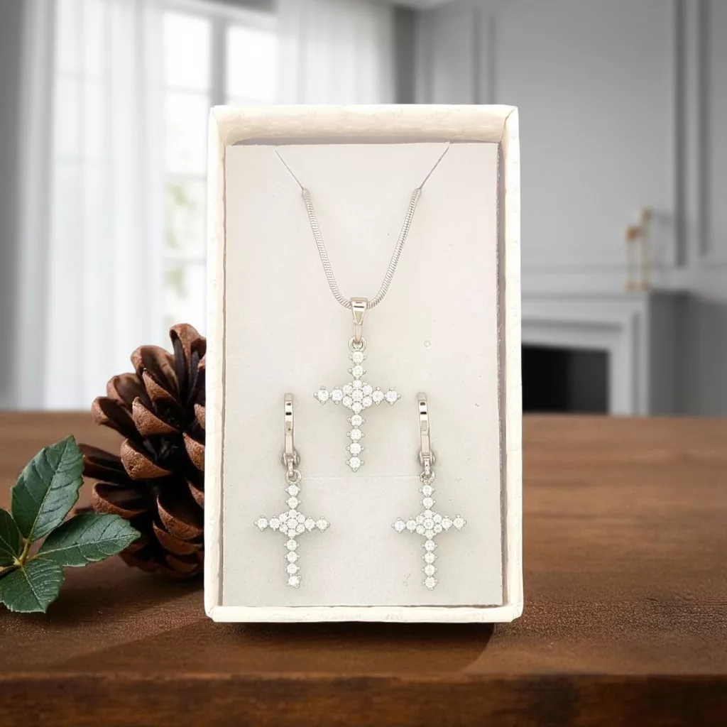 Ezüstszínű nyaklánc, keresz medál és szív függővel díszített fülbevaló együttese, melyet fehér cirkónia kristályok tesznek csillogóvá.