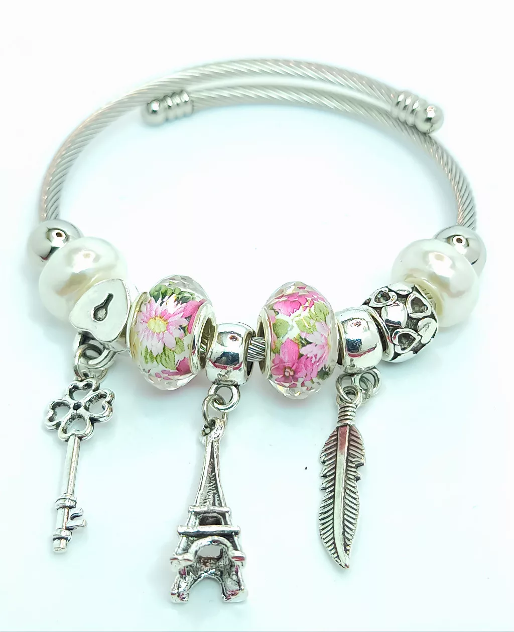 Ezüstszínű nemesacél ( 316L ) pandora jellegű karkötő, melyet lakat, kulcs, Eiffel torony és toll mintás charmok, fehér és virágmintás kristályok díszítenek.