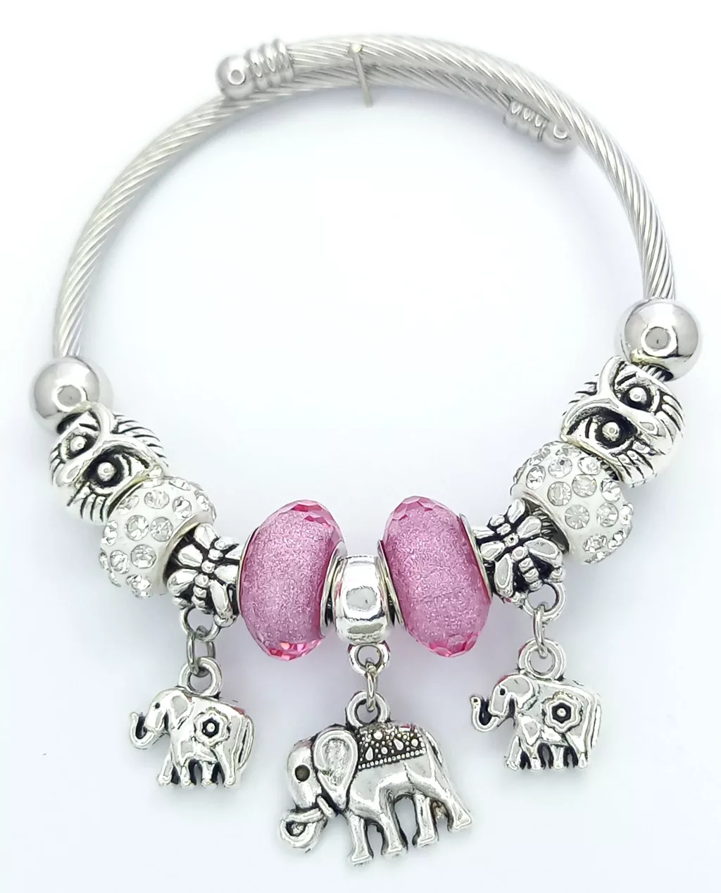 Ezüstszínű nemesacél ( 316L ) pandora jellegű karkötő, melyet szerencse hozó elefánt, bagoly charmok, fehér és rózsaszín cirkónia kristályok díszítenek.