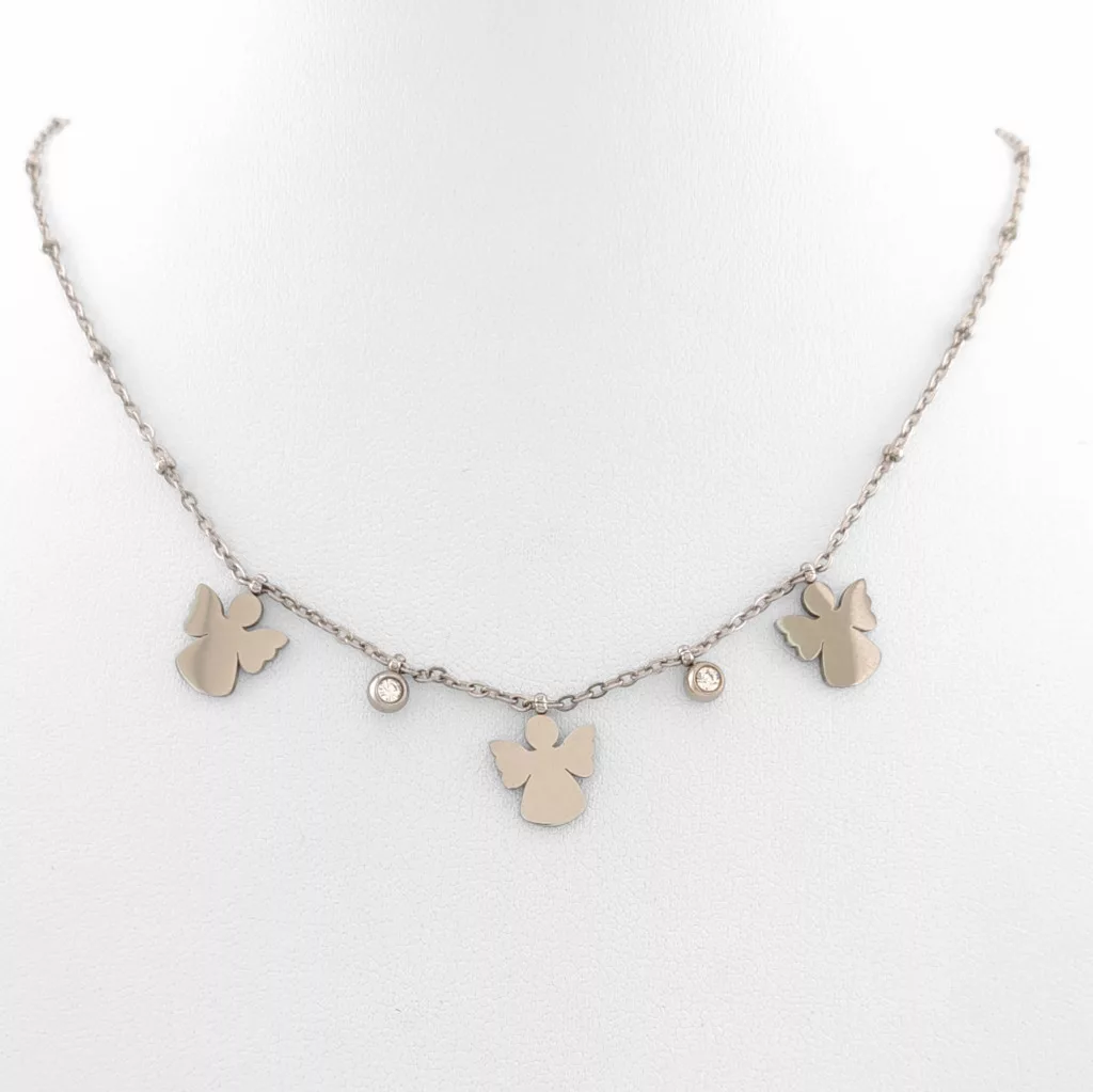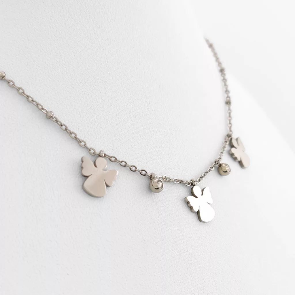 Ezüstszínű nemesacél ( 316L ) nyaklánc, nemesacél ( 316L ) angyalka medálok, apró gömbök és csillogó fehér cirkónia kristályok díszítenek.