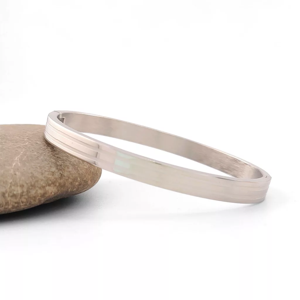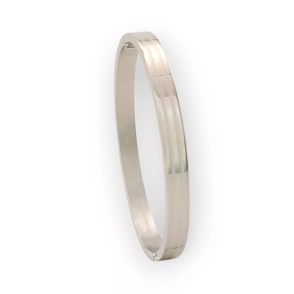 Ezüstszínű nemesacél (316L) karperec, melyet mattosított sávok díszítenek.