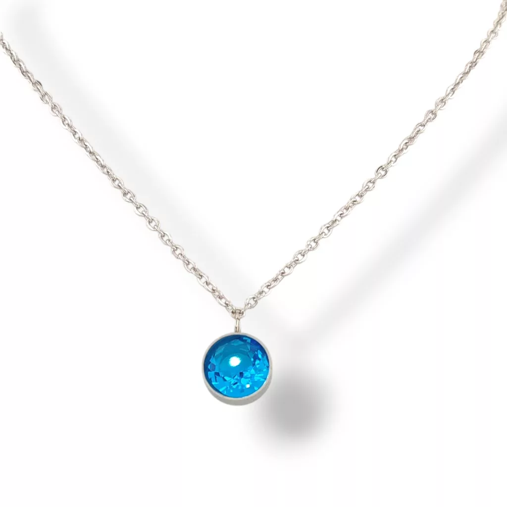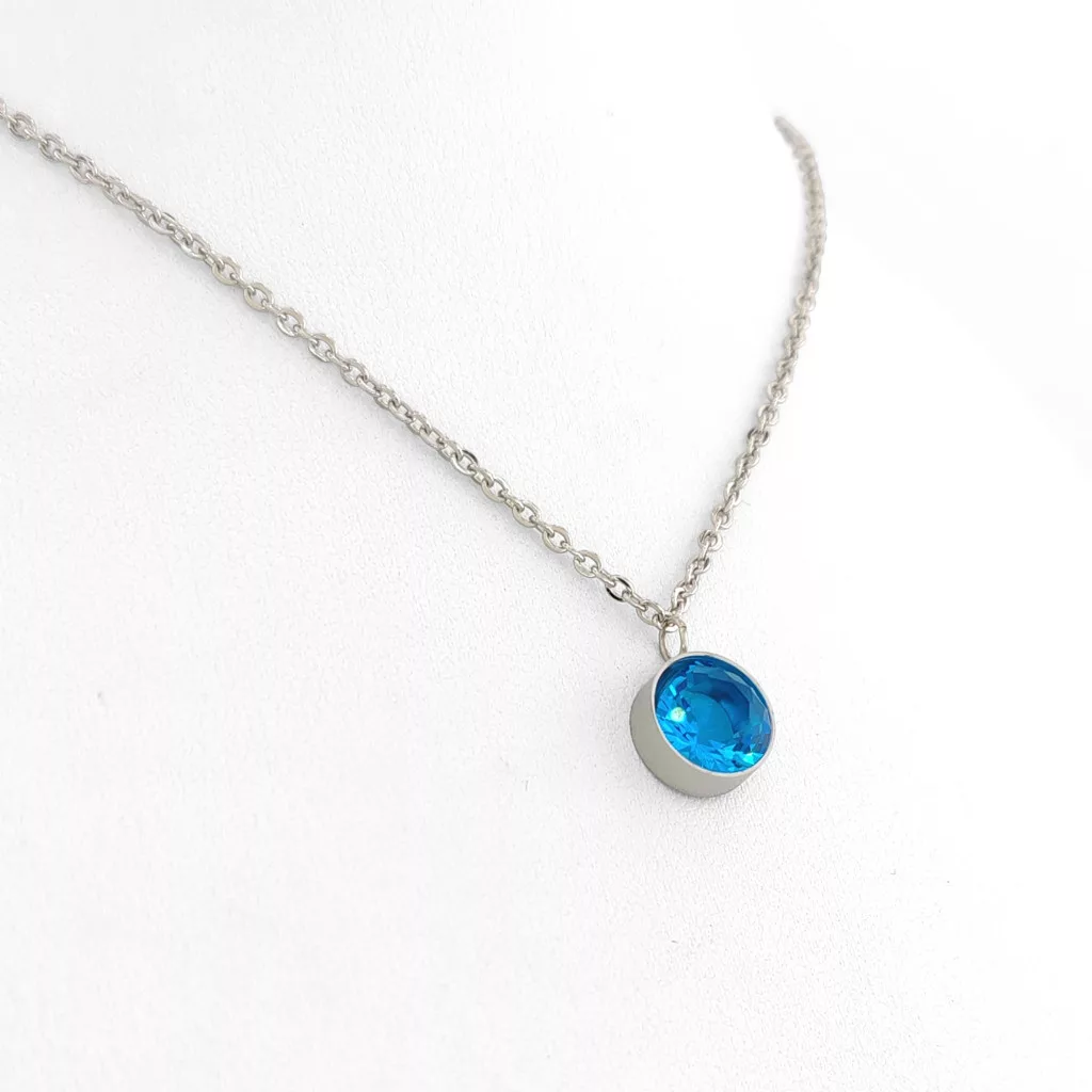 Ezüstszínű nemesacél ( 316L ) nyaklánc, csillogó égszínkék cikrónia kristály medállal.