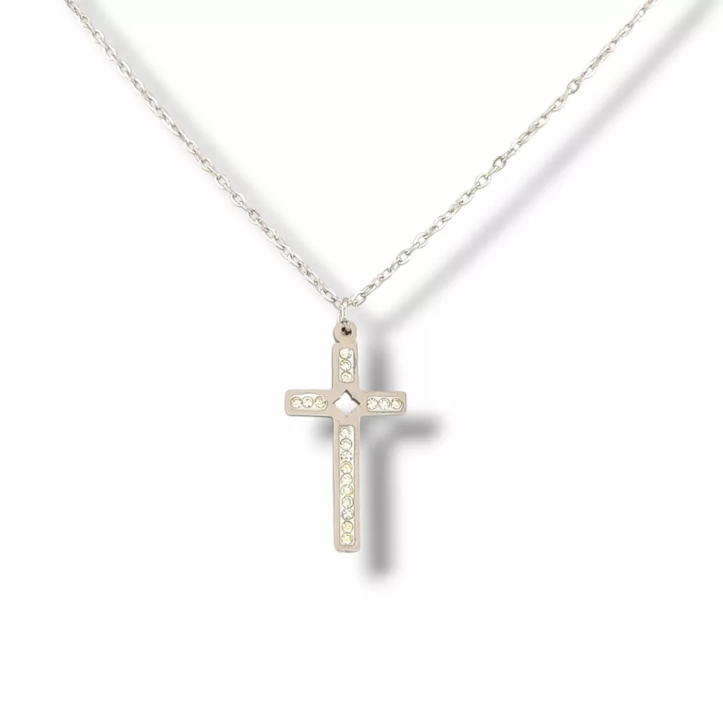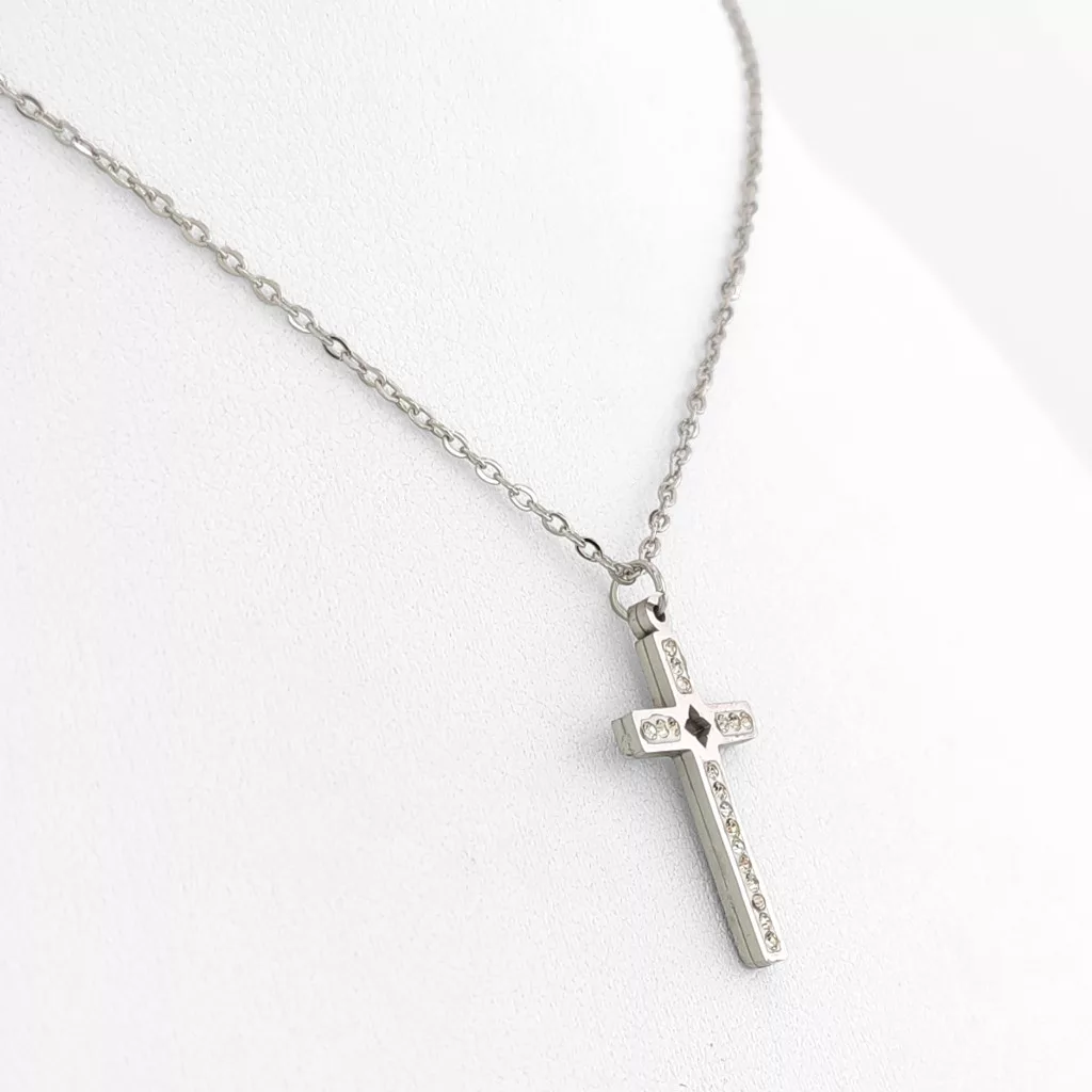 Ezüstszínű nemesacél ( 316L ) nyaklánc, csillogó fehér cirkónia kristállyal díszített kereszt medállal.