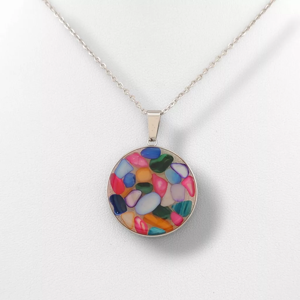 Ezüstszínű nemesacél ( 316L ) nyaklánc, színes lencse medállal.