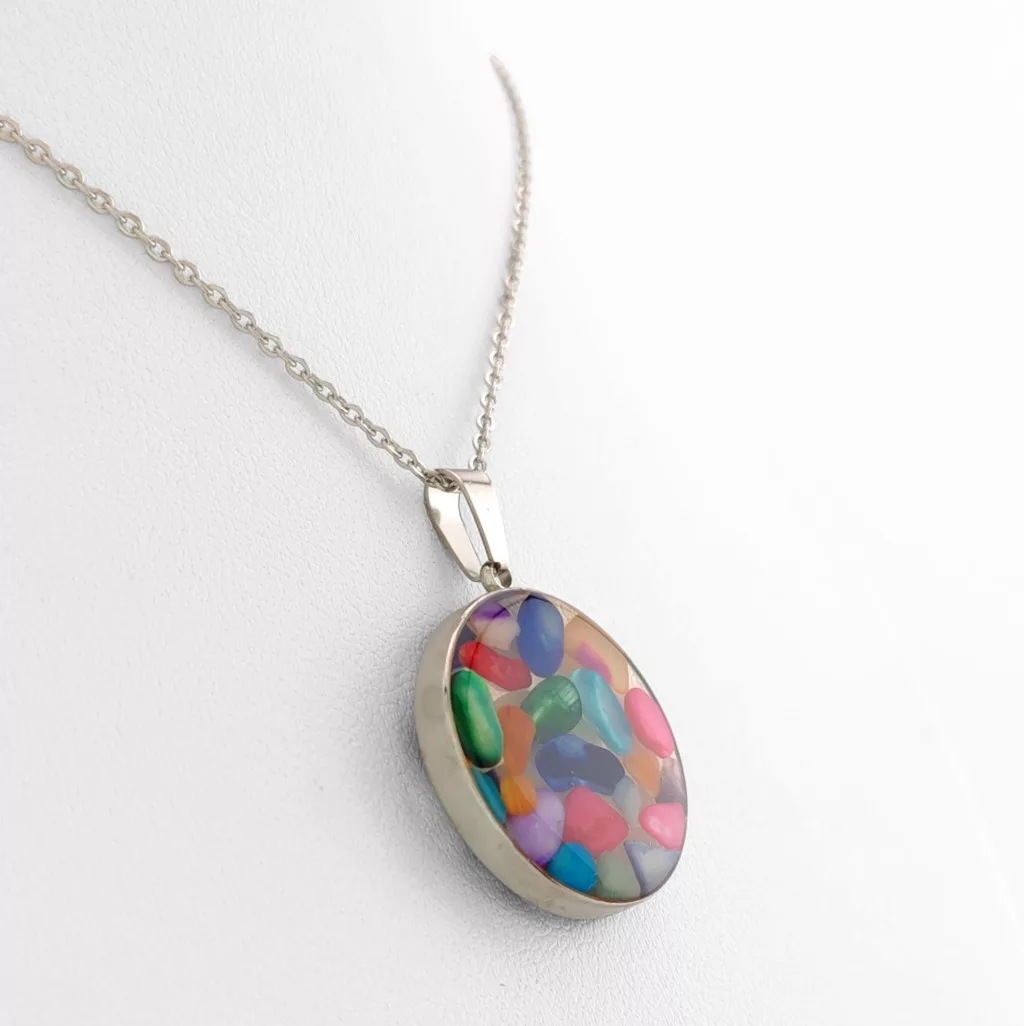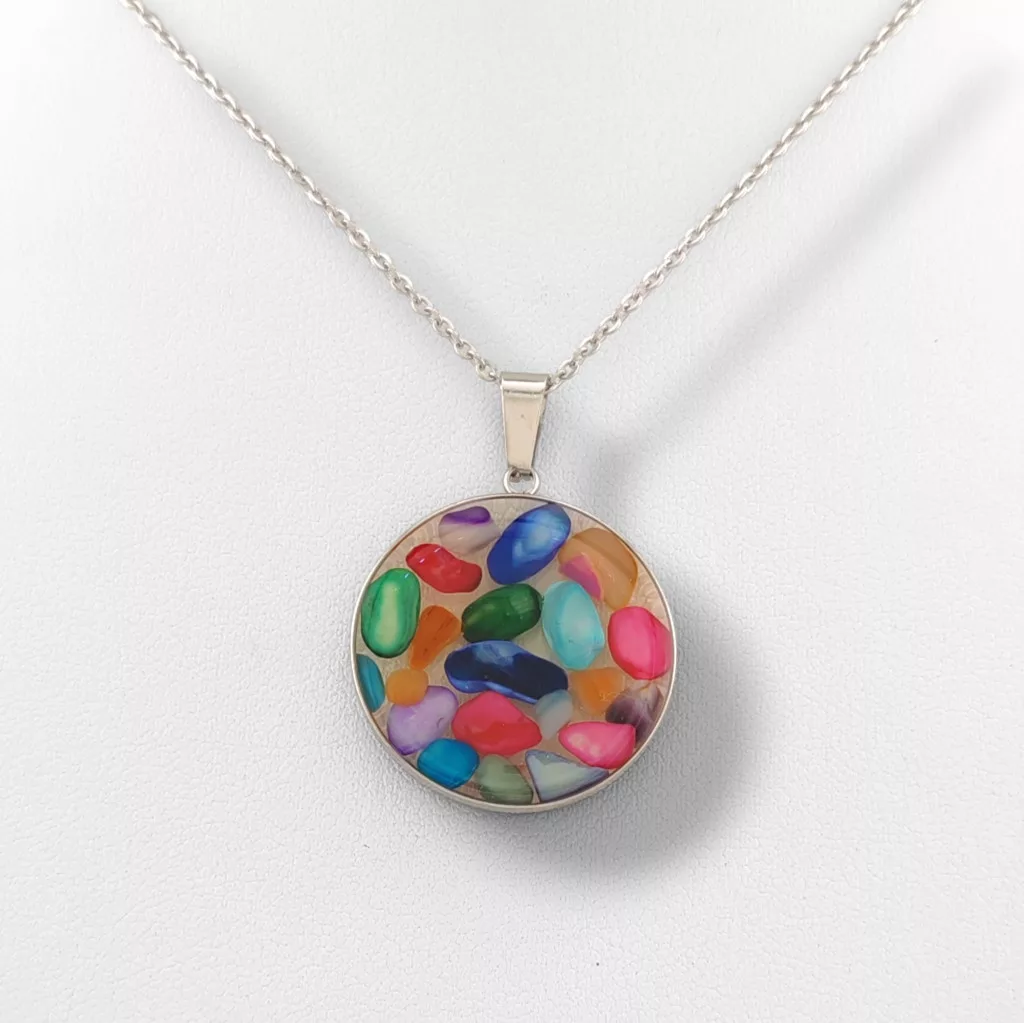 Ezüstszínű nemesacél ( 316L ) nyaklánc, színes lencse medállal.