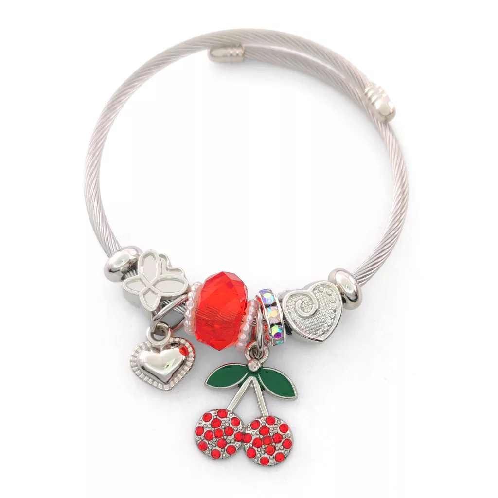 Ezüstszínű nemesacél pandora jellegű karperec cseresznye és szív charmokkal