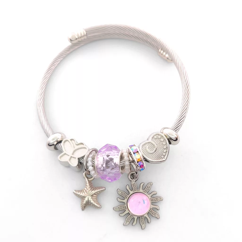 Ezüstszínű nemesacél pandora jellegű karperec nap és szív charmokkal
