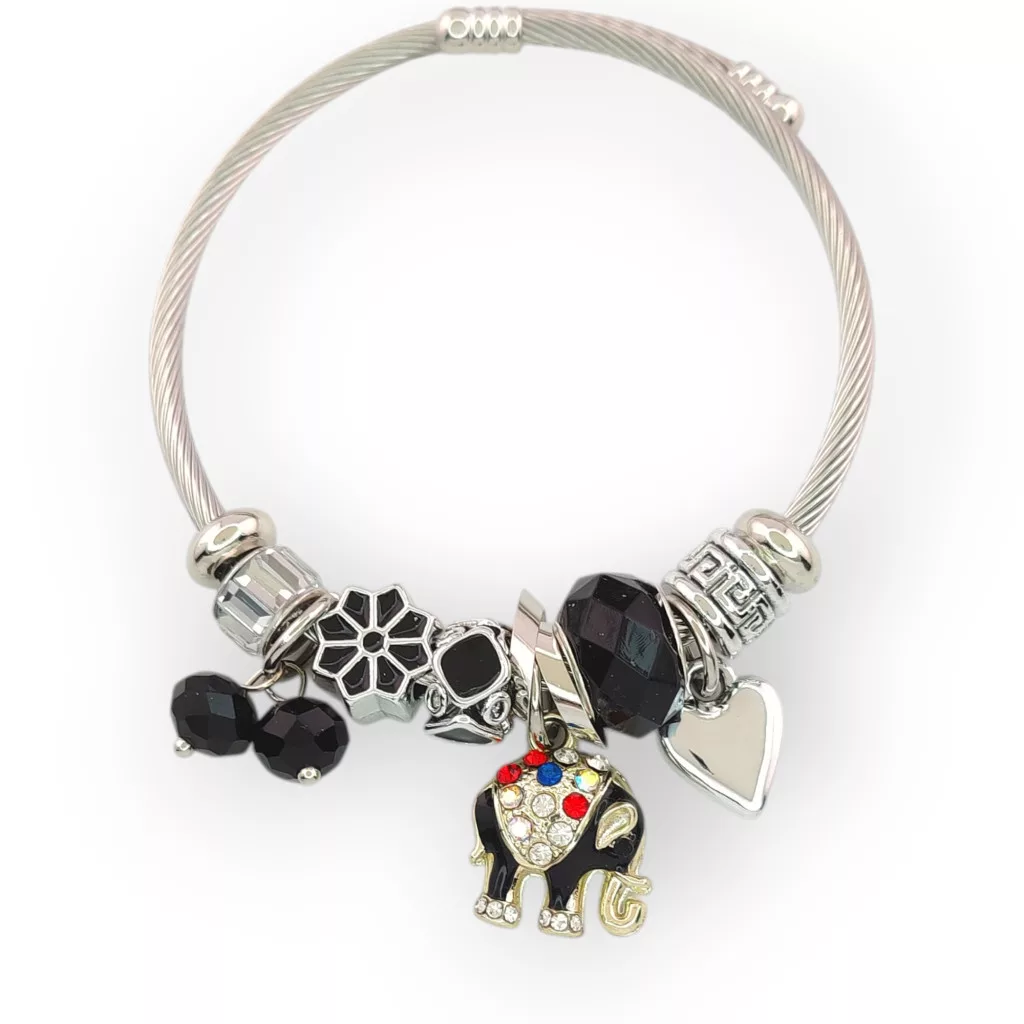 Ezüstszínű nemesacél pandora jellegű karperec, melyet szerencse elefánt charmok és fekete kristályok díszítenek. Az elefántot változó összetételben piros, fehér és színjátszós kristályok díszítik.