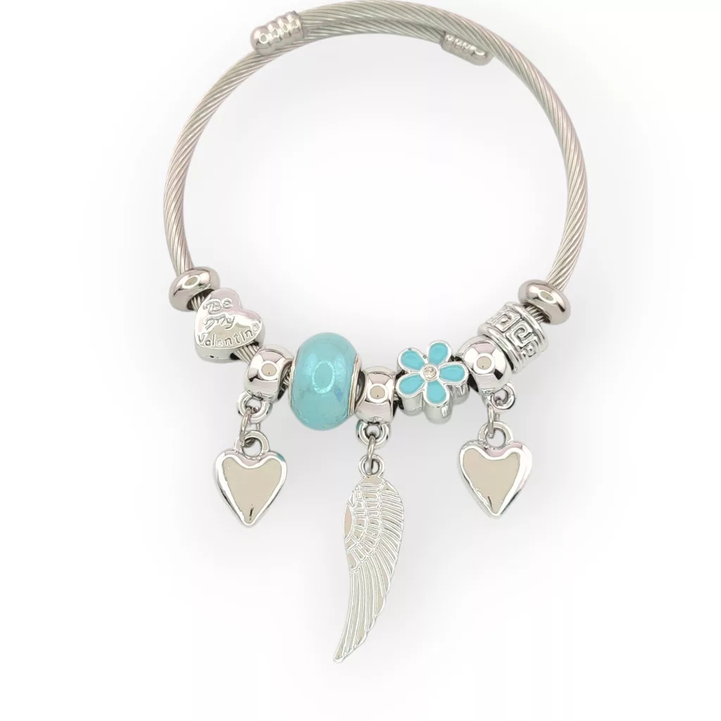 Ezüstszínű nemesacél pandora jellegű karperec, melyet angyalszárny, szív, türkizkék virág charmok díszítenek.