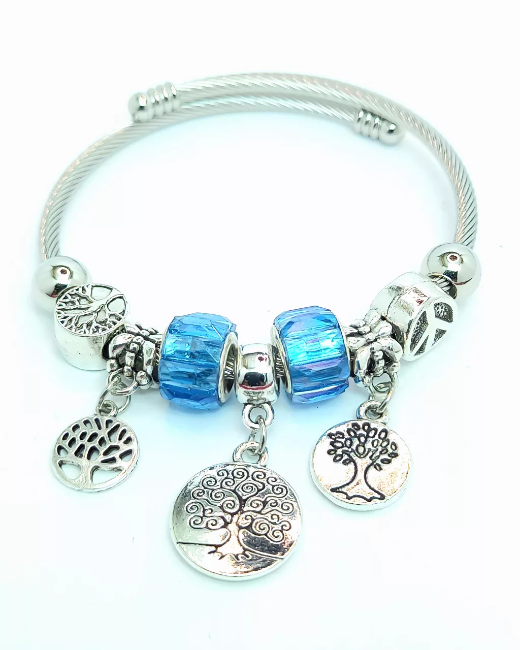 Ezüstszínű nemesacél pandora jellegű karkötő, melyet életfa és béke jel mintás charmok és tengerkék kristályok díszítenek.