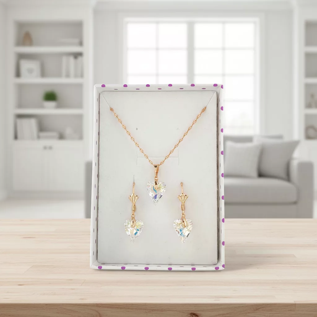 Aranyszínű nyaklánc, csillogó fehér Swarorvski szív kristály medál és fehér Swarovski kristályos szív fülbevaló együttese.