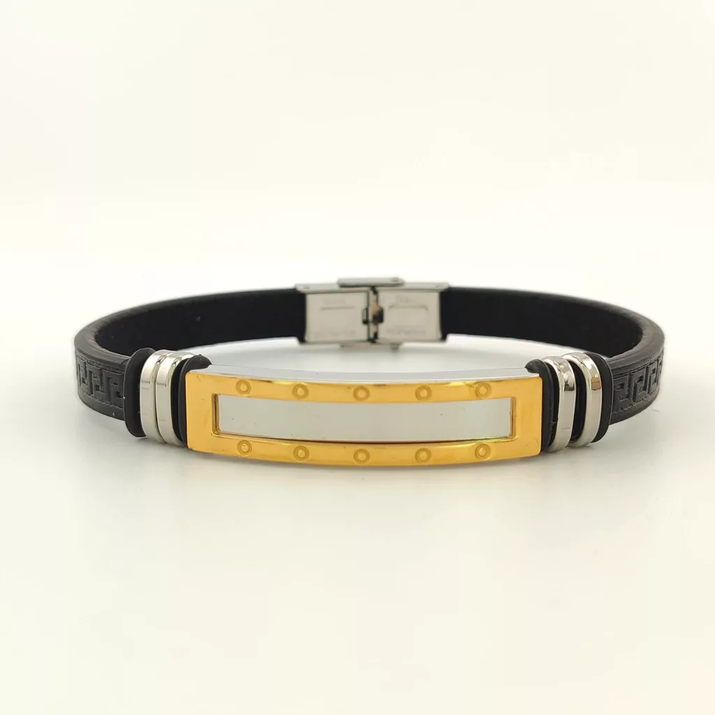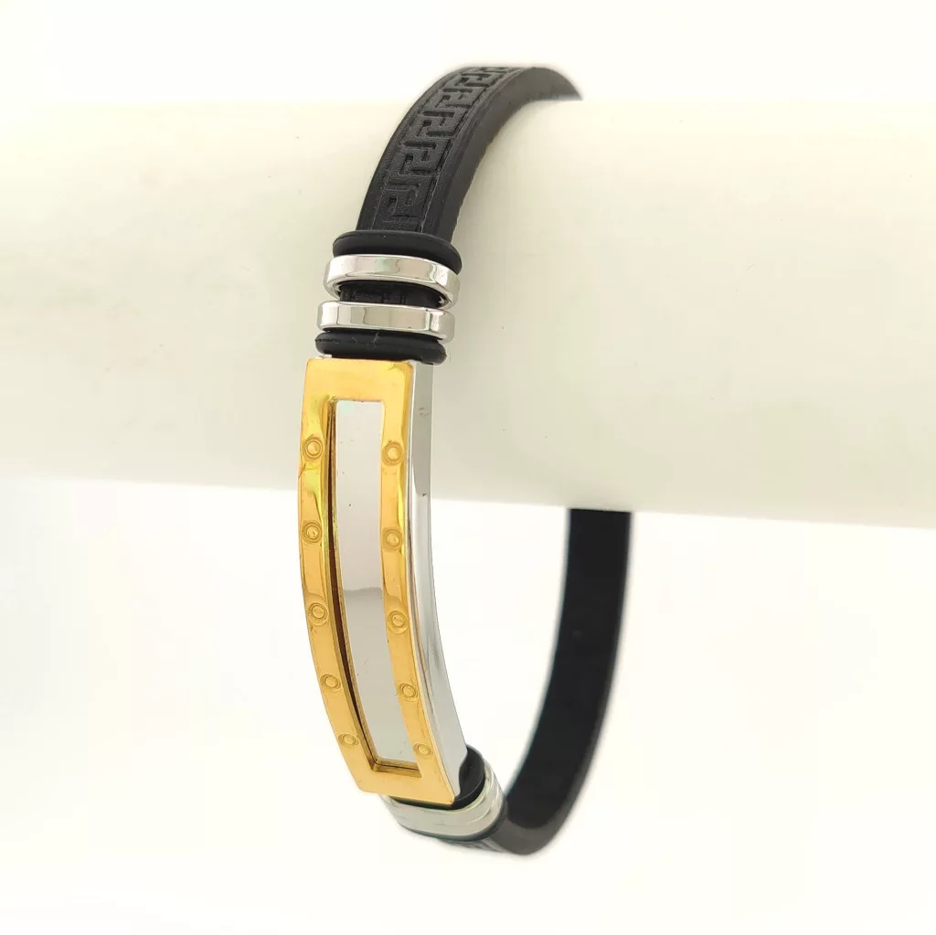 Fekete bőr, görög mintával díszített karkötő, arany-ezüstszínű nemesacél (316L) betéttel.