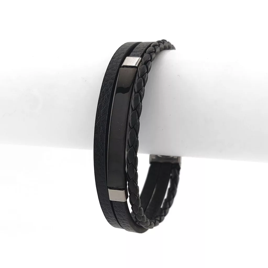 Fekete bőr karkötő fekete nemesacél gravírozható betéttel