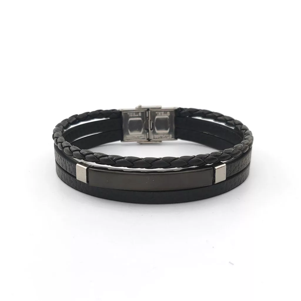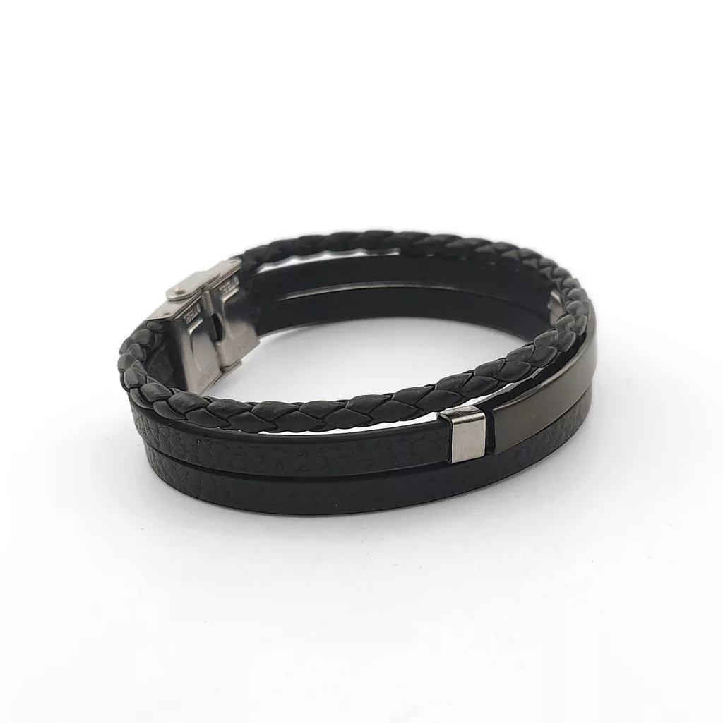 Fekete, három soros bőr karkötő, nemesacél (316L) gravírozható betéttel és csattal.