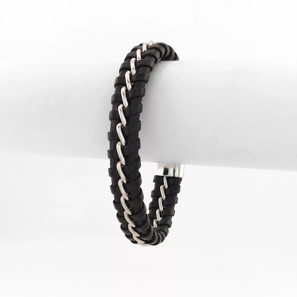Fekete, fonott bőr karkötő, nemesacél (316L) díszítéssel és csattal.