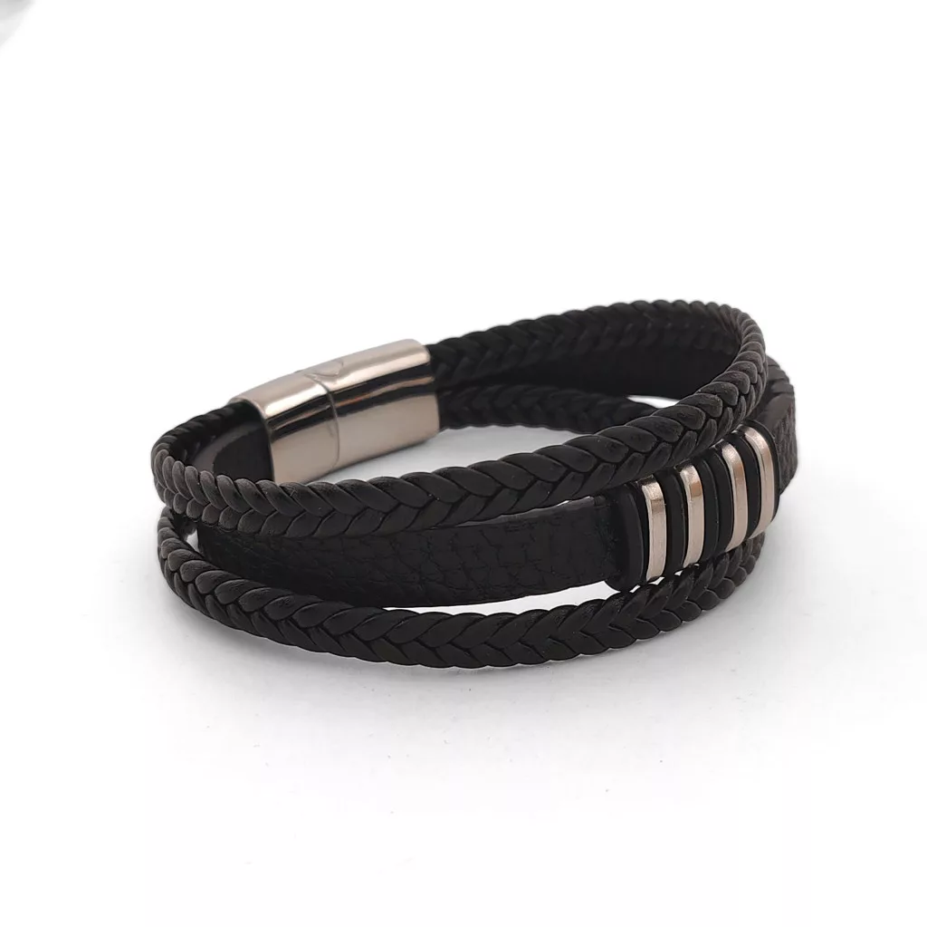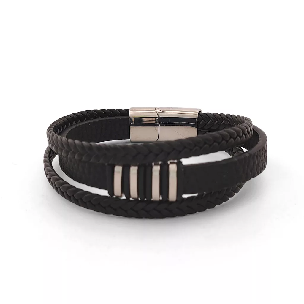 Fekete, három soros bőr karkötő, nemesacél (316L) díszítéssel és csattal.
