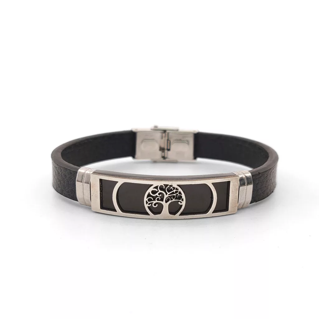 Fekete bőr karkötő, nemesacél (316L) életfa mintás díszítéssel és csattal.