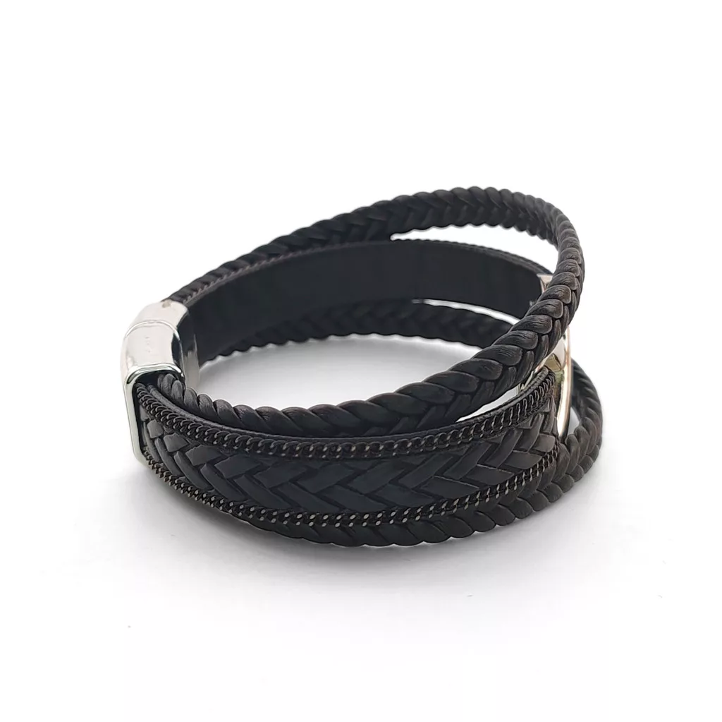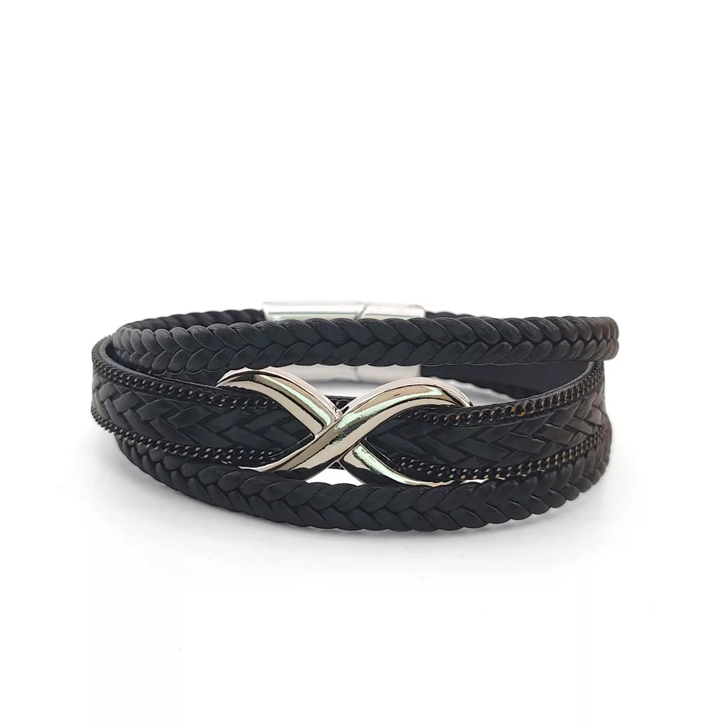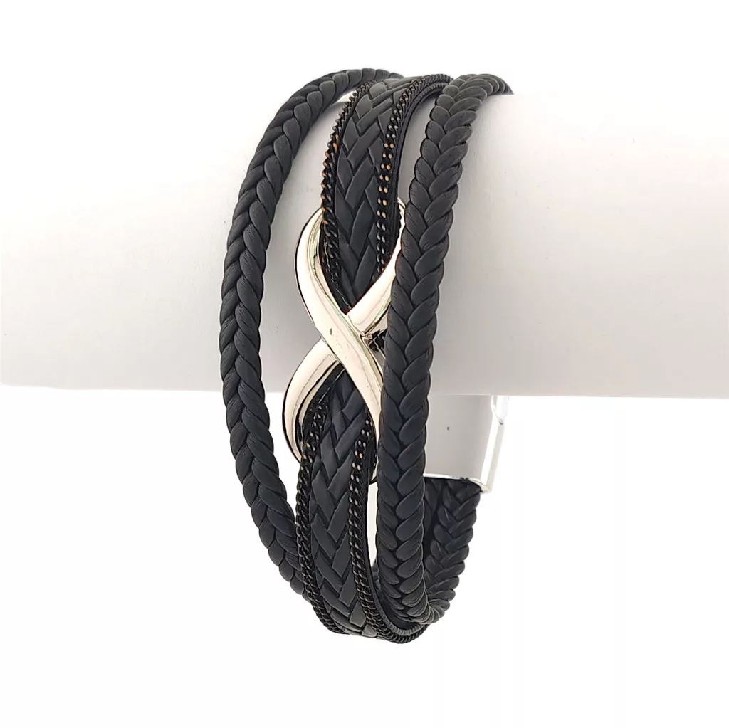 Fekete, három soros fonott bőr karkötő, ezüstszínű nemesacél (316L) végtelen jel díszítéssel és csattal.