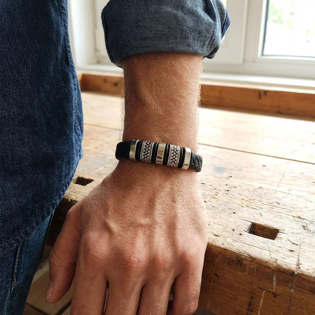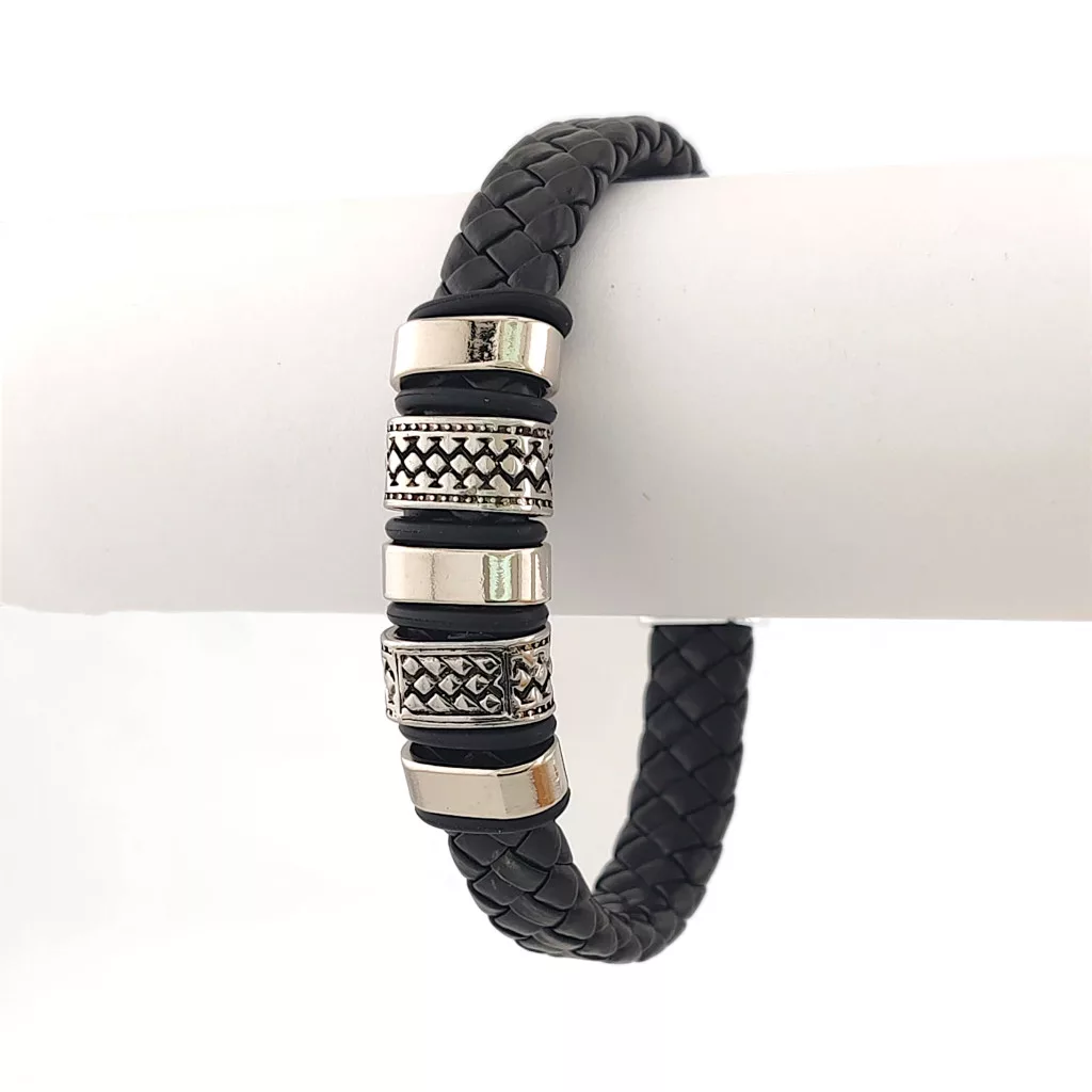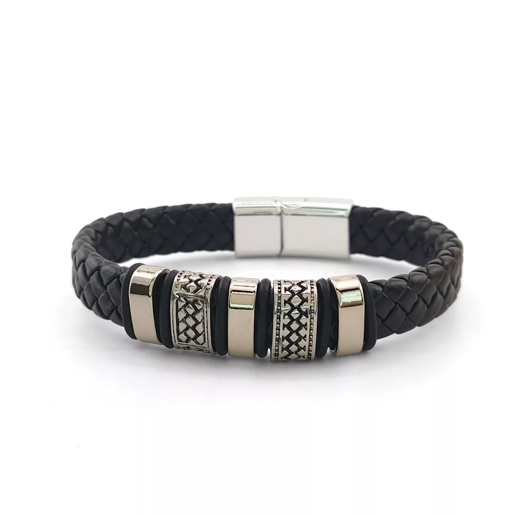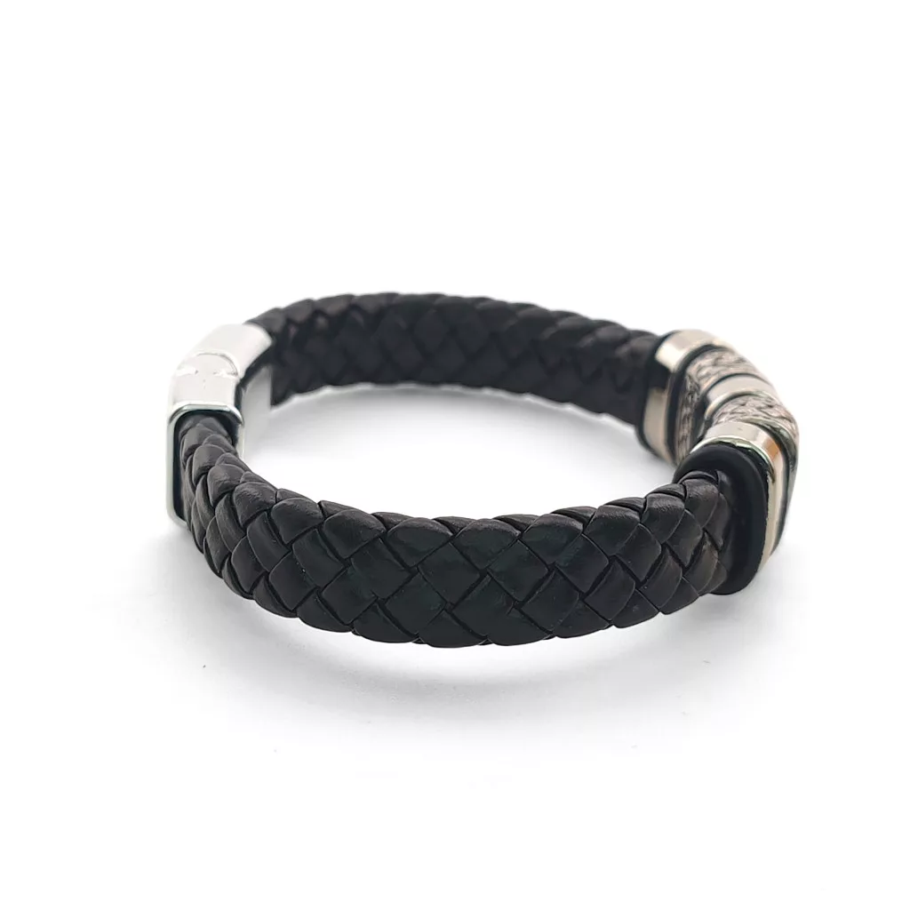 Fekete színű, fonott bőr karkötő, ezüstszínű nemesacél (316L) díszítéssel és csattal.