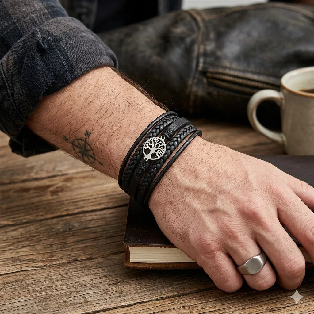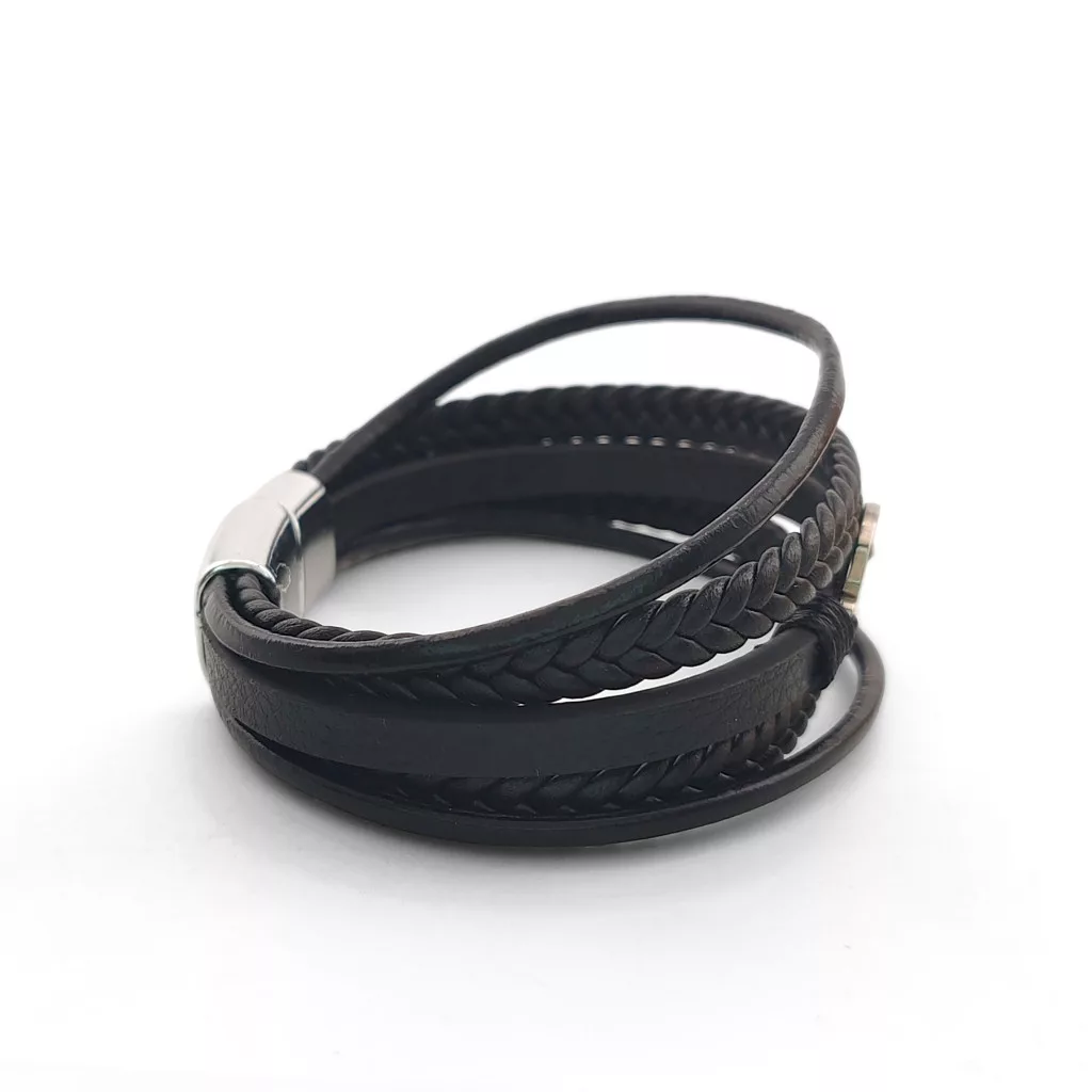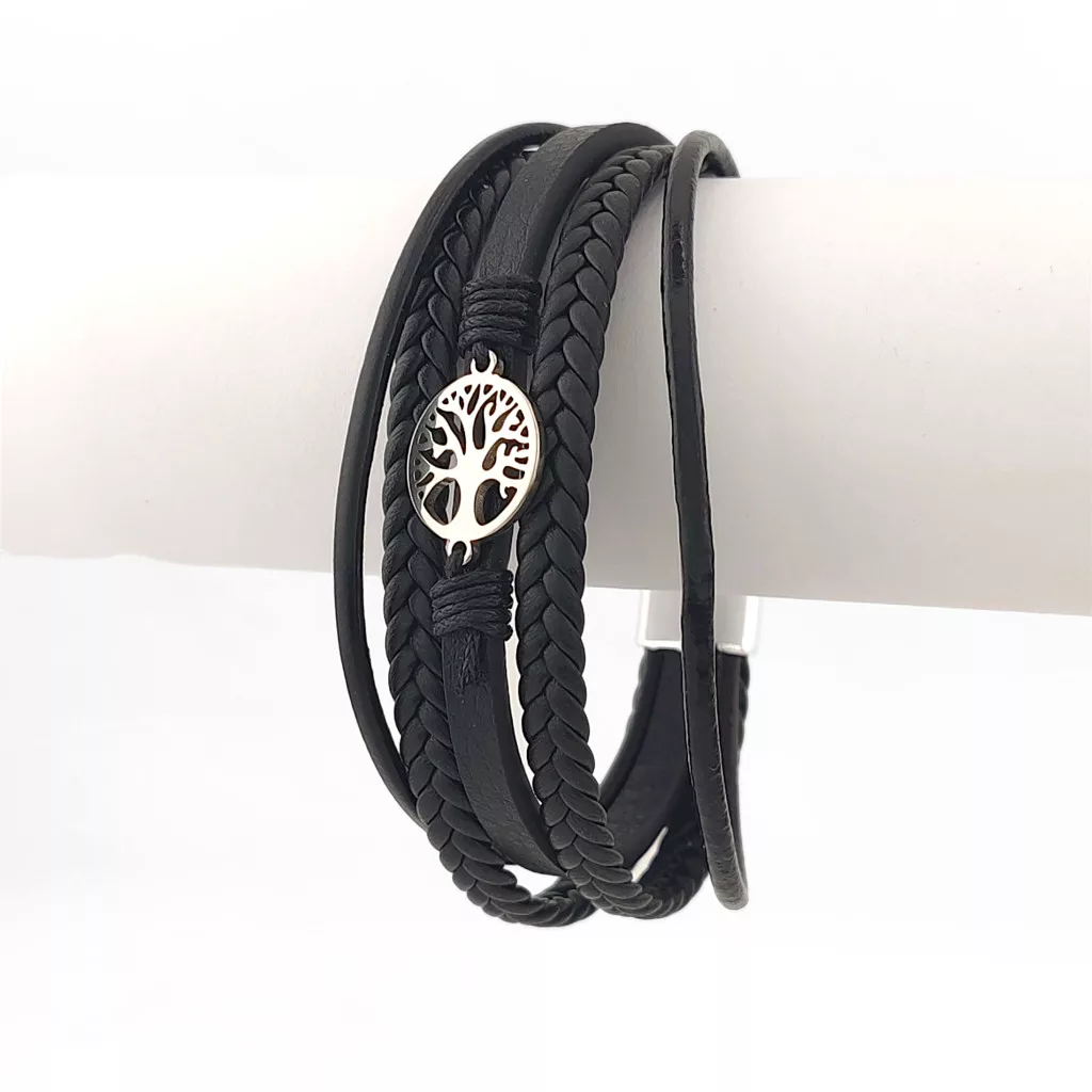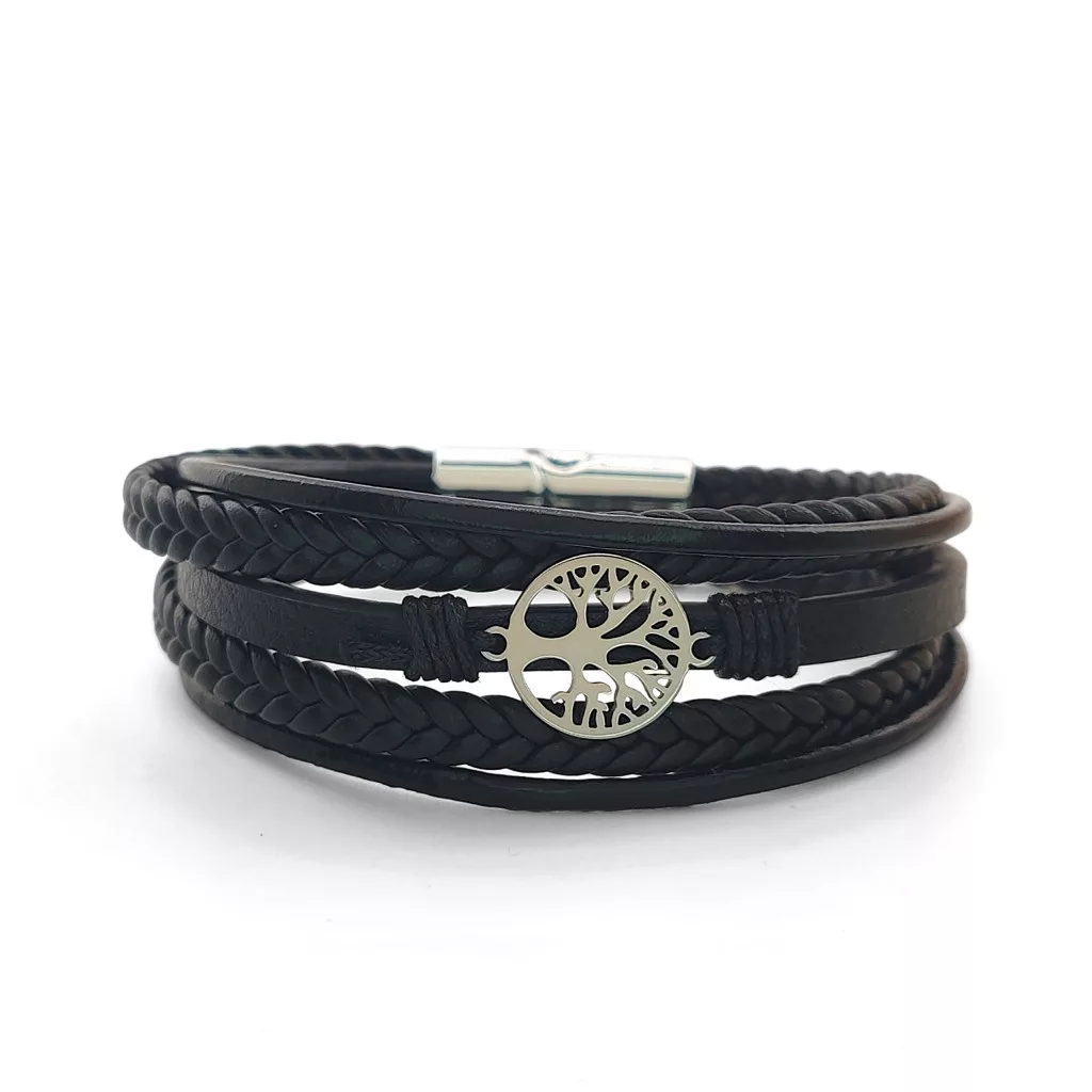 Fekete, öt soros bőr karkötő, nemesacél (316L) életfa díszítéssel és csattal.