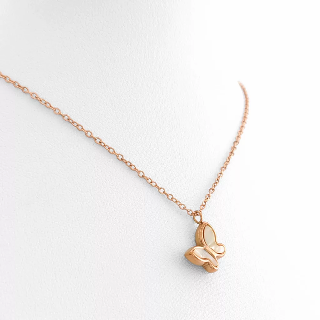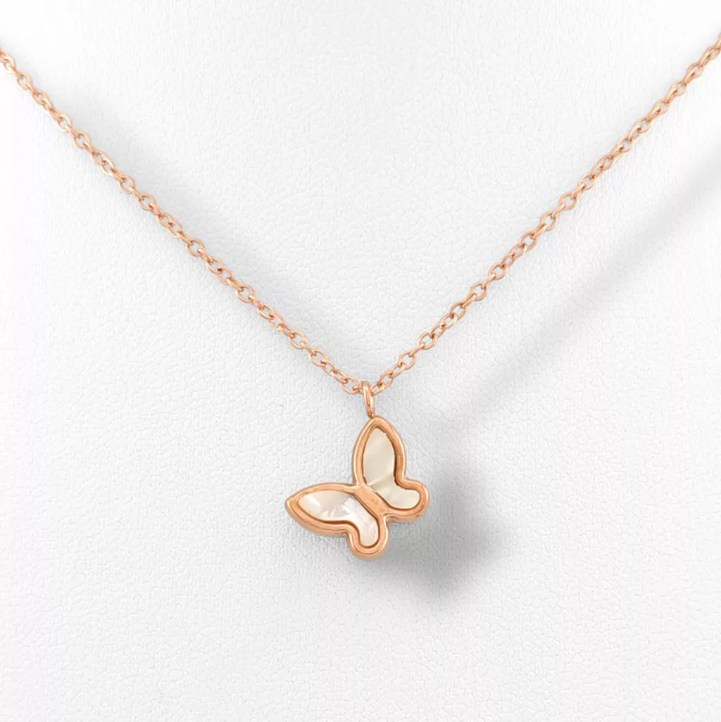 Rose gold színű nemesacél ( 316L ) nyaklánc, csillogó fehér kagyló belsős pillangó medállal.