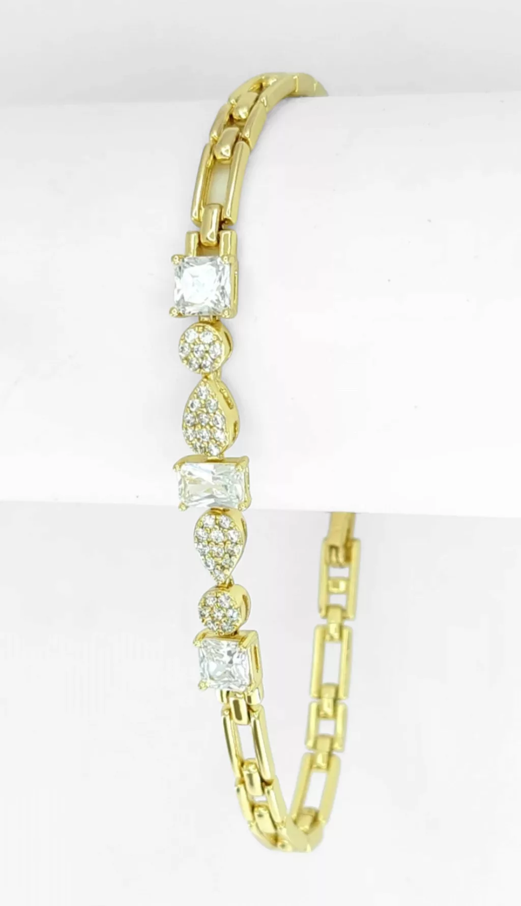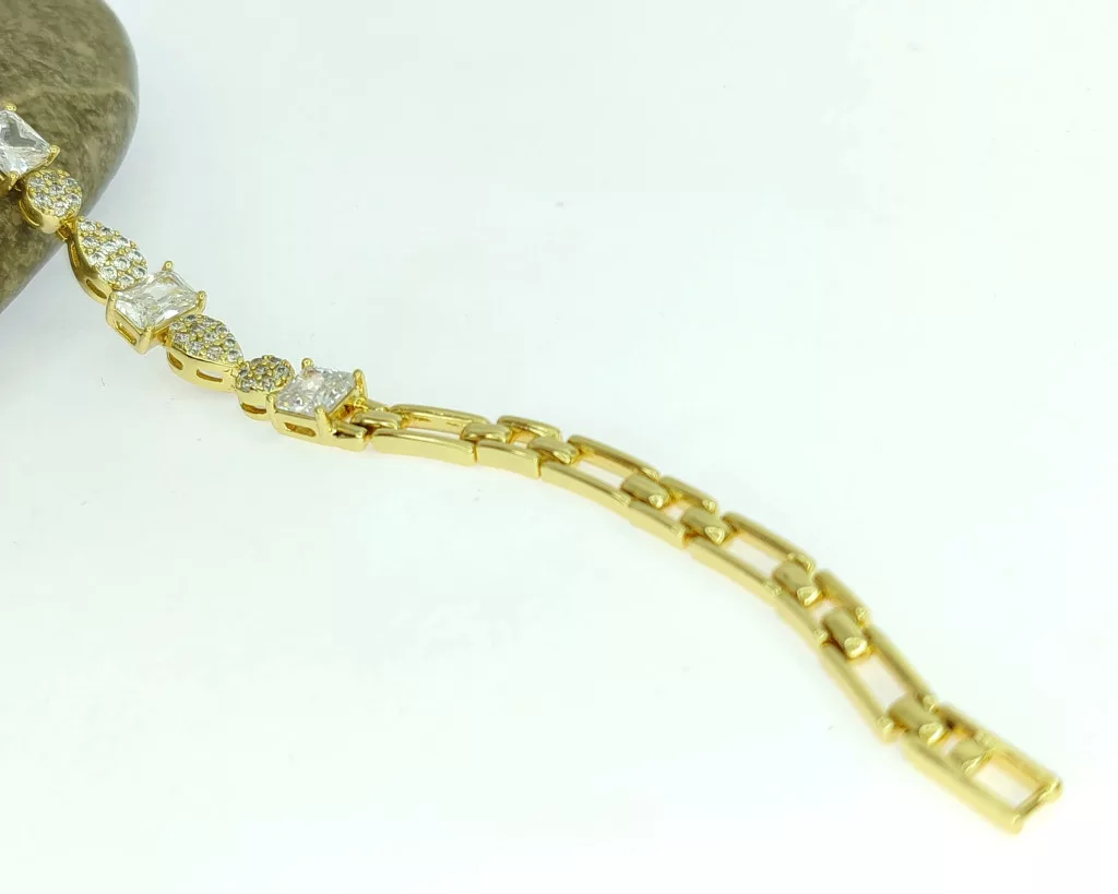 Aranysárga színű karkötő, melyet fehér cirkónia kristályok tesznek csillogóvá.