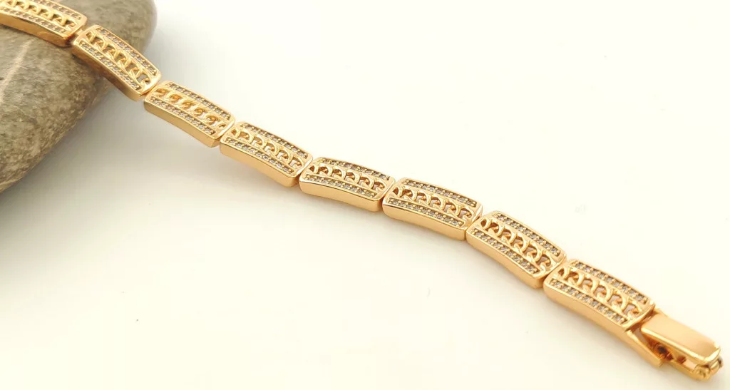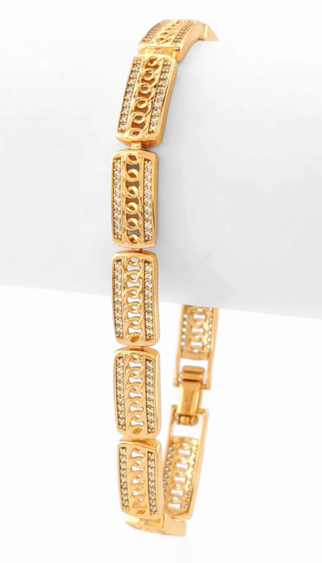 Aranyszínű karkötő, melyet fehér cirkónia kristályok tesznek csillogóvá és áttört minta díszít.