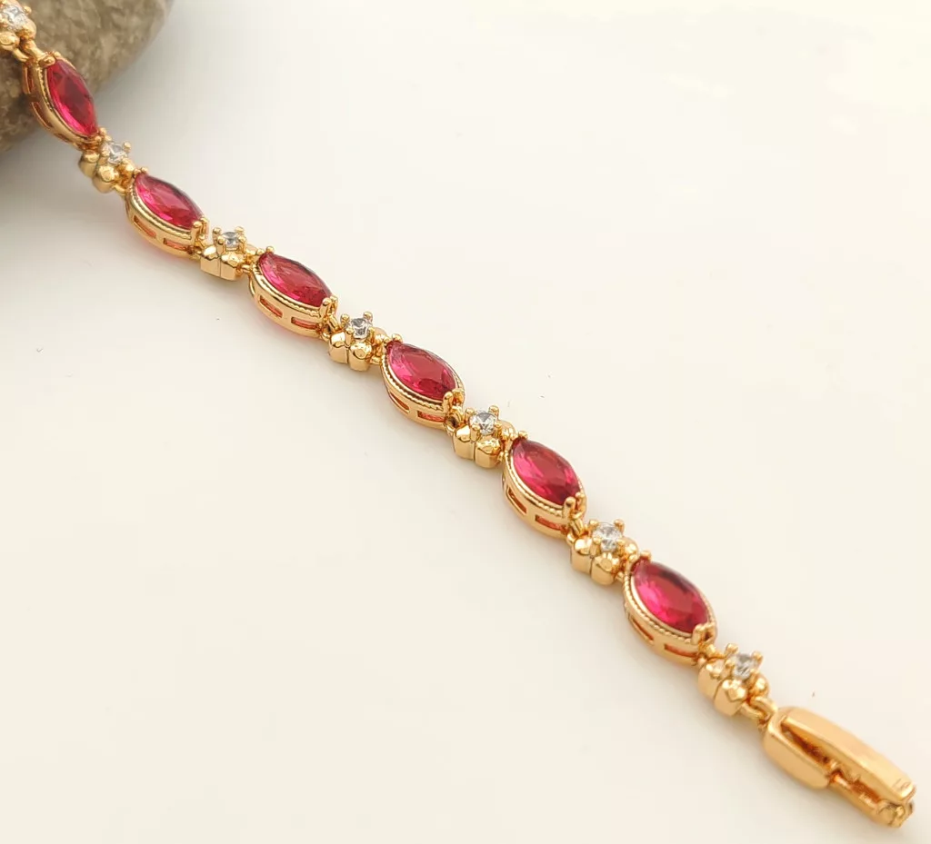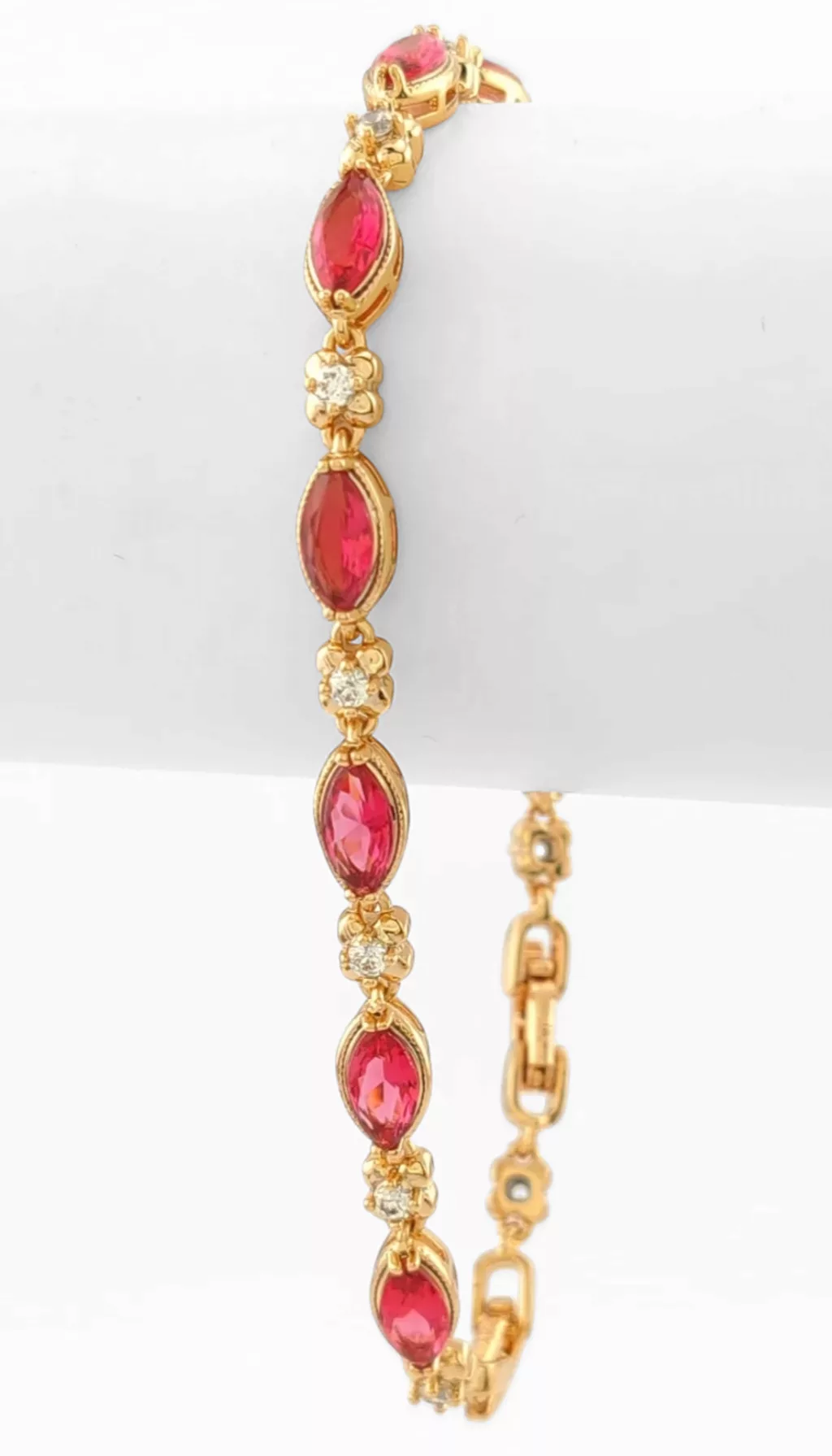 Aranyszínű karkötő, melyet piros és fehér cirkónia kristályok tesznek csillogóvá.